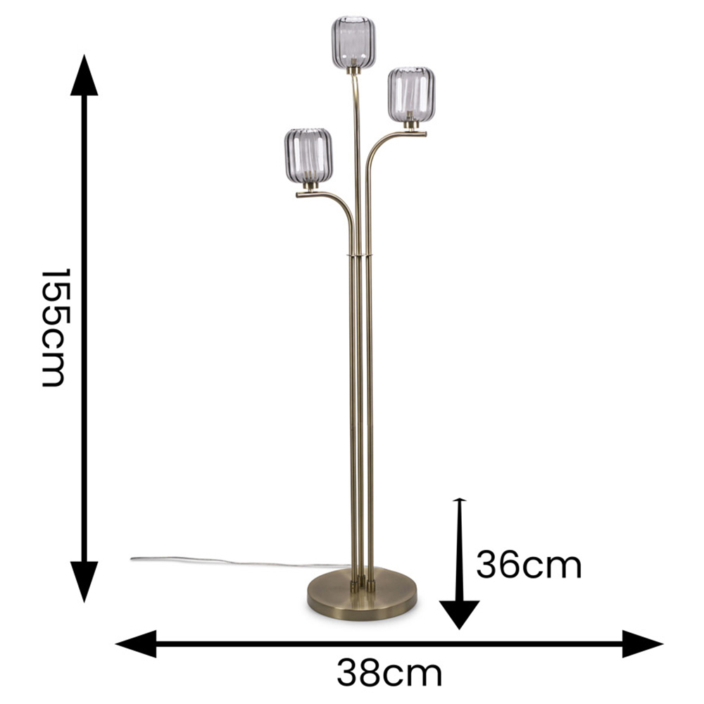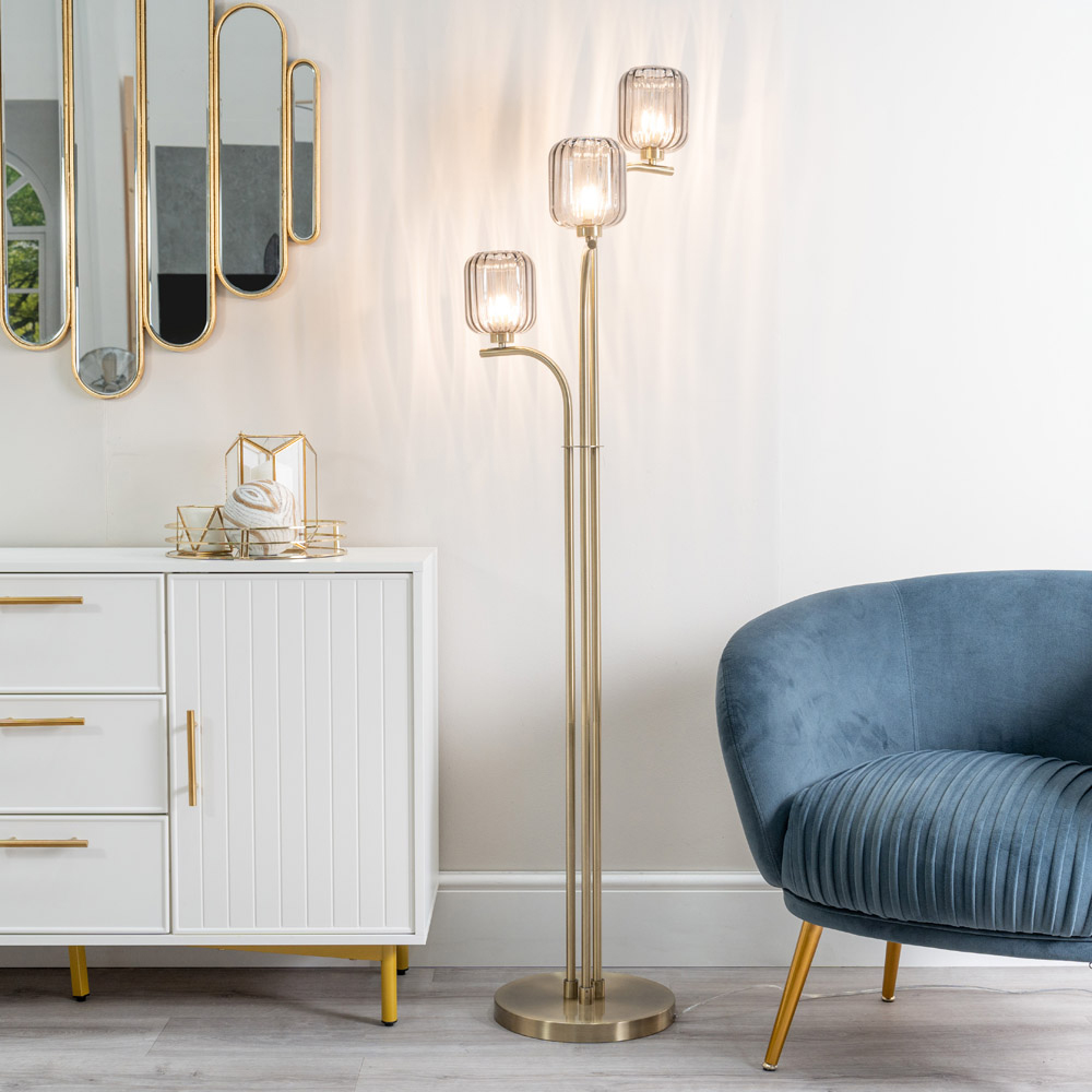 Add a beautiful touch to your home decor with the ValueLights Amelie 3 Way Ribbed Glass Gold Stem LED Floor Lamp. This three-way floor lamp features a subtle hint of colour with tinted ribbed glass and sleek gold stems. This elegant lamp also features a solid base for stability and support. It comes with LED bulbs to enhance and brighten up your interior space. It has a sleek finish and can be wiped with a clean dry cloth for easy maintenance. This floor lamp comes with a one-year warranty.