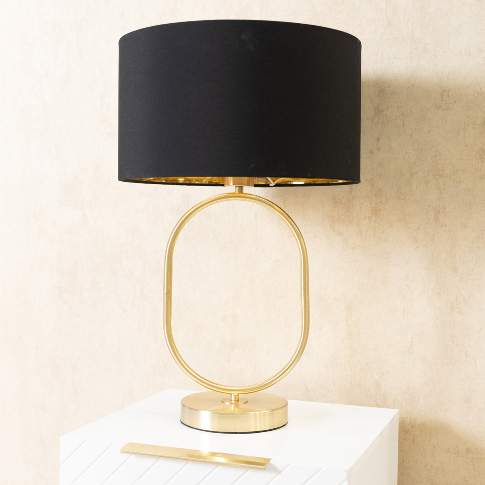 Introducing Antonia, the embodiment of luxe and elegance in the form of a brushed gold table lamp. With its Art Deco-inspired oval shape and a striking black and gold drum shade, this lamp not only illuminates your space but also adds a significant touch of glamour. The sleek gold finish and graceful lines ensure that Antonia stands out, while the inclusion of a suitable LED bulb means you can enjoy its warm glow immediately upon setup. Perfect for those who appreciate sophisticated lighting solutions, Antonia is designed to make a statement in any room.