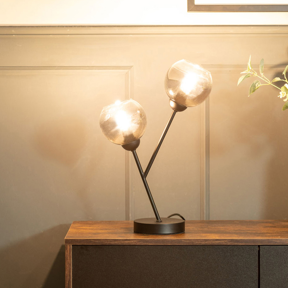 Add a touch of industrial style and character to your home with this black metal table lamp. Featuring a two way design with smoked glass lampshades. The in-line rocker switch provides convenient control, making it easy to illuminate your space. Transform your room in seconds with this simple yet stylish design. Perfect for adding a minimalist touch to your living space.