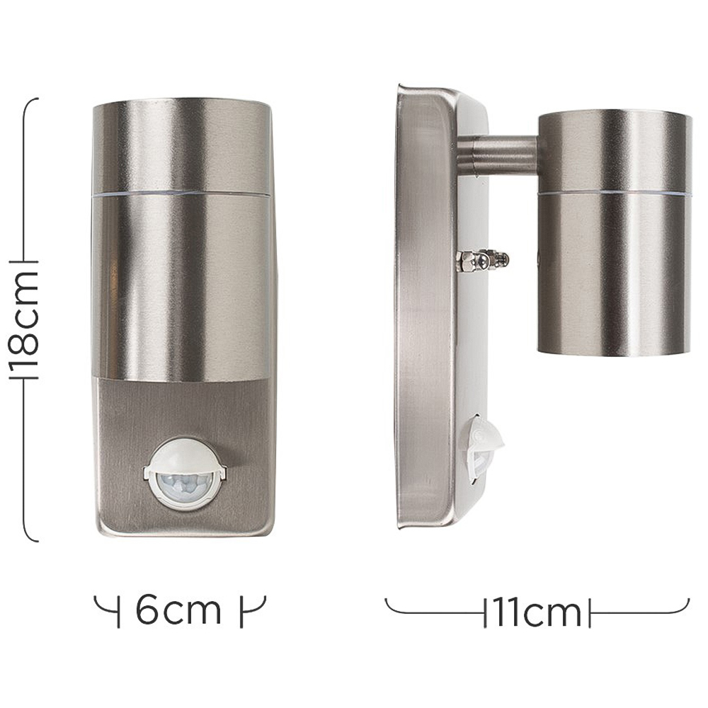 Illuminate your home decor with the ValueLights Barrow Silver Outdoor Wall Downlight with PIR Motion Sensor. This modern outdoor wall lantern is perfect for creating a warm and inviting glow on doorways, porches, and external walls. It incorporates PIR motion sensor detector technology, which means it will light up as you approach, making it both convenient and energy efficient. This lantern is a stylish addition that provides both security and outdoor decorative lighting. The light shines from the bottom of the lantern and comes with a five-watt cool white LED bulb, so you're all set for installation.