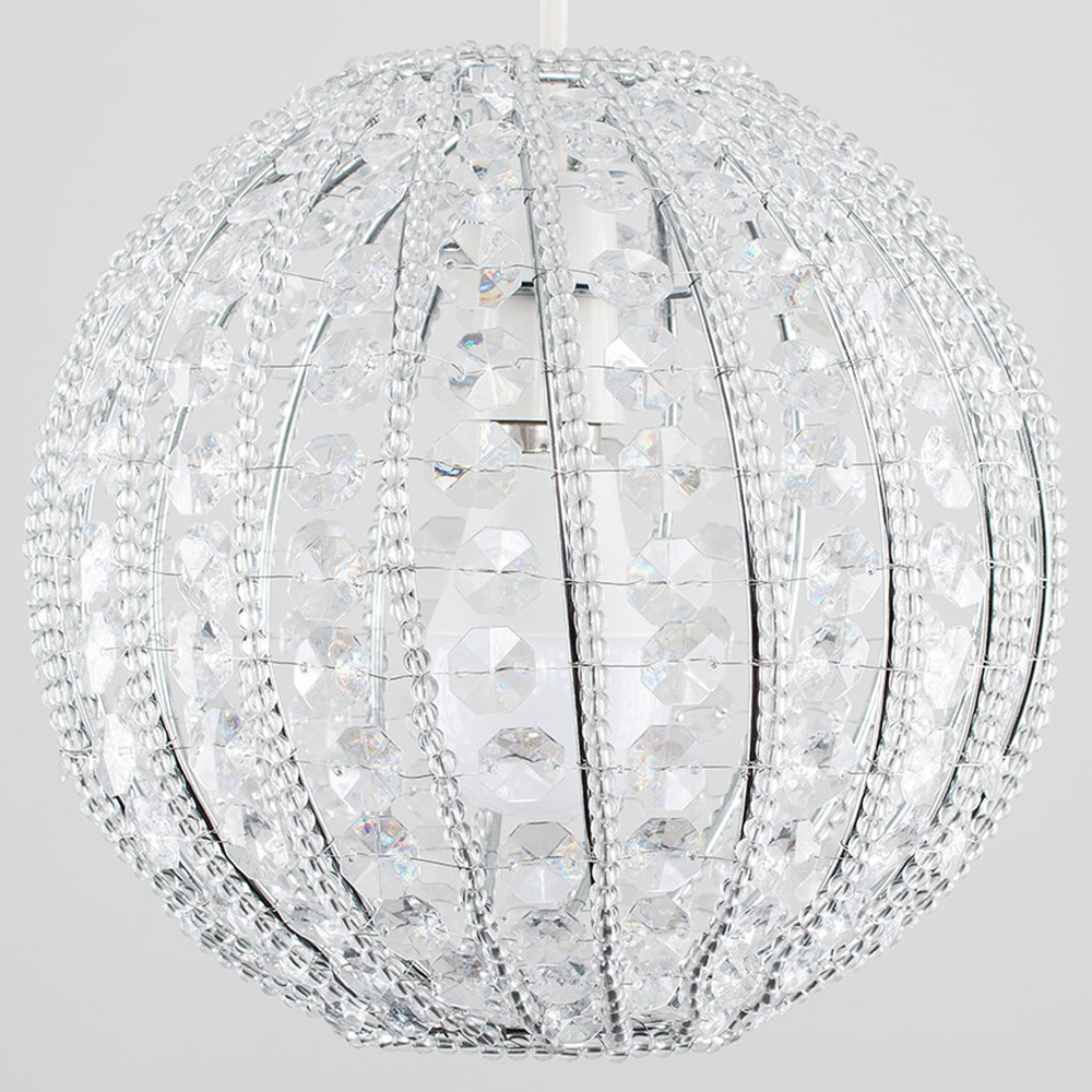 Change your décor with the ValueLights Bead Acrylic Ball Pendant Shade. This modern round shade features clear acrylic jewels and beads that reflect light beautifully. It fits effortlessly onto standard ceiling light sockets with no wiring required. Suitable for use with both general domestic and energy-saving bulbs, this non-electric ceiling pendant shade is a quick and economical way to update any room in seconds. Dimensions: H20.5 x Dia24cm.