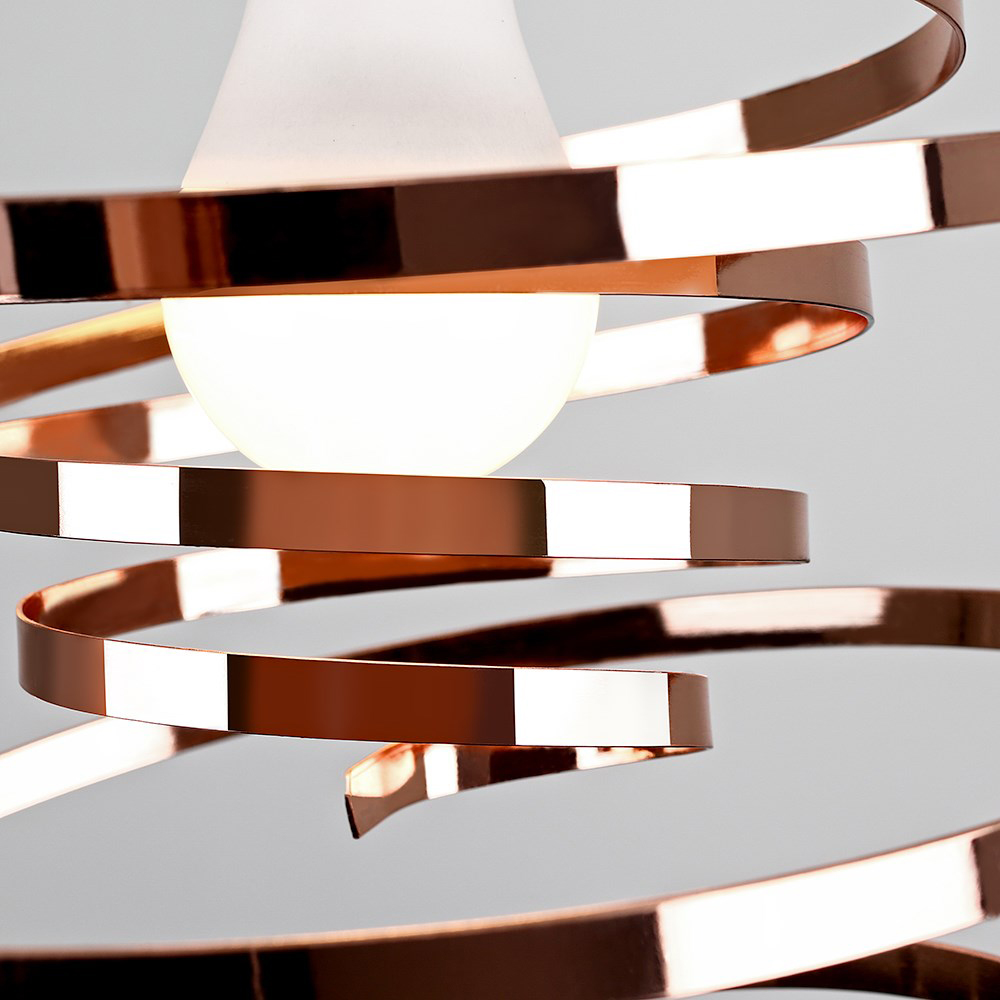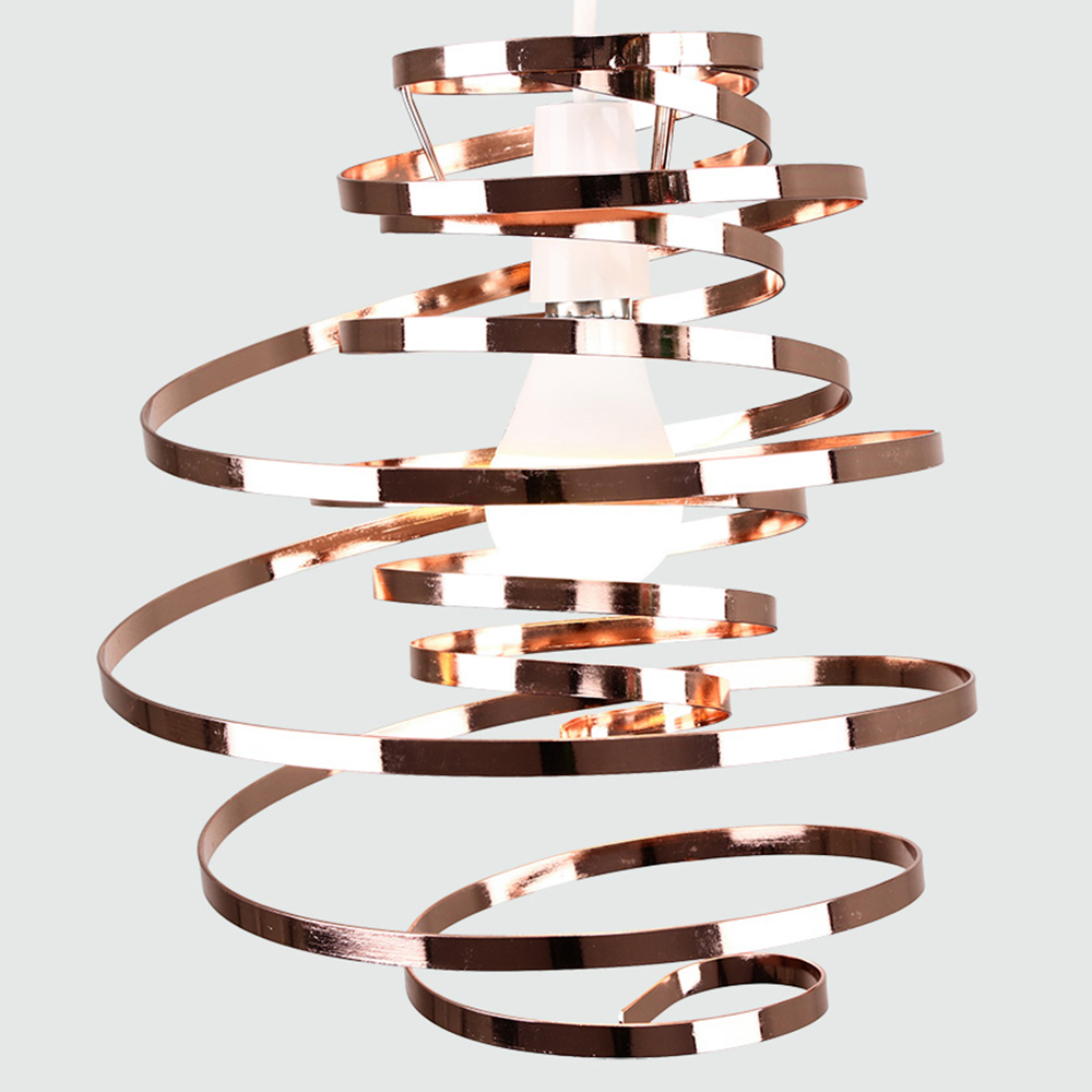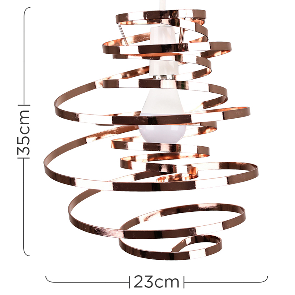 Transform your lighting with the ValueLights Bensson Copper Twisted Pendant Shade. With a wonderful, twisted dancing gymnastics ribbon spiral design, this is a stylish and modern addition to any room, giving a new funky look to any home. It fits easily to existing light sockets without the need for wiring. Dimensions: H35 x Dia23cm.