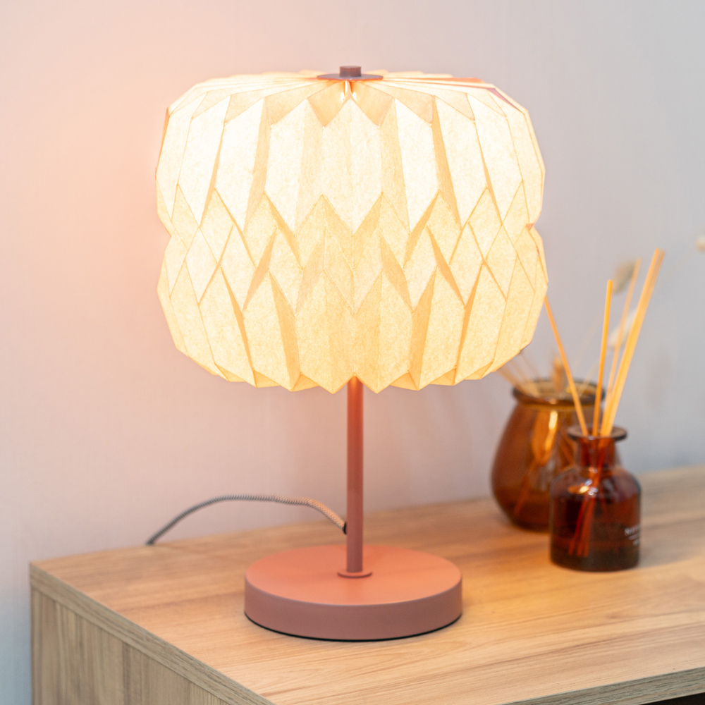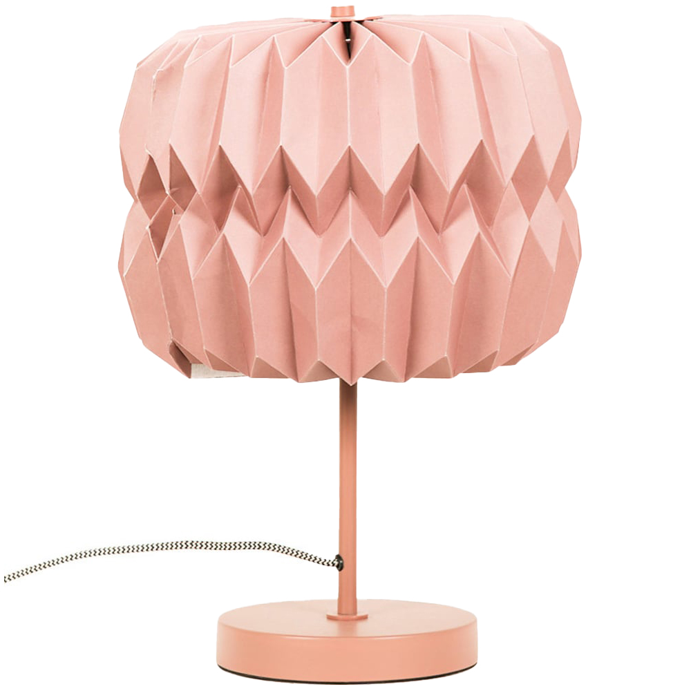Add a contemporary element to your décor with this on trend table lamp. Featuring a metal stem in a rusty pink finish complete with a matching paper fold, pleated lampshade. The in-line on / off rocker switch provides convenient control, making it easy to illuminate your space. Whether your style is modern, or more sleek and minimalist, this lamp will fit perfectly into any room in your home. Dimensions - H38 x W28 x D28cm.