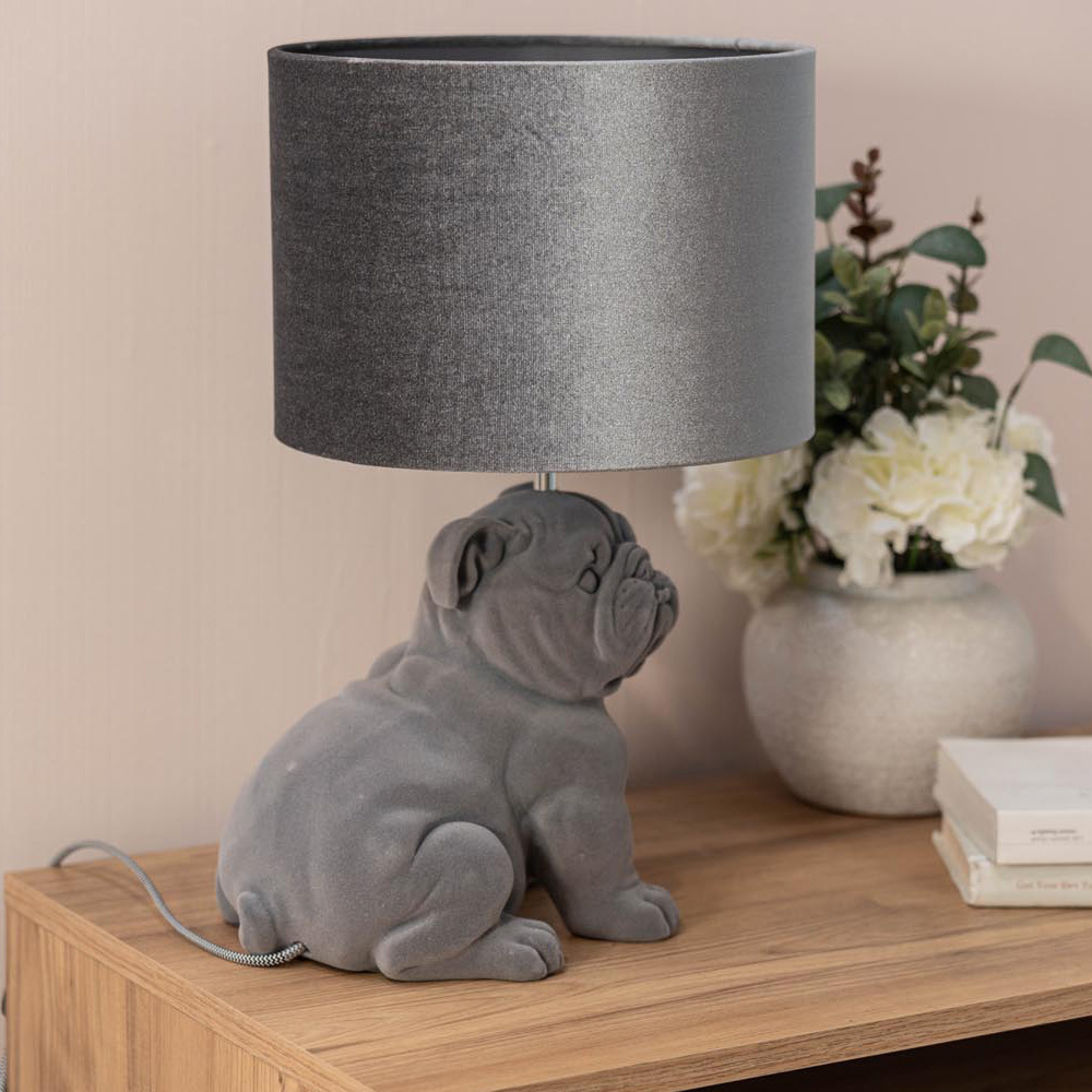 Add some character and charm to your home with this bulldog table lamp. Complete in a grey velvet finish with a co-ordinating grey drum shade, this lamp is sure to be a showstopper that’ll brighten any room. The in-line rocker switch provides convenient control, making it easy to illuminate your space. This table lamp is a unique piece of lighting that will add a touch of personality and style, transforming your room in seconds.