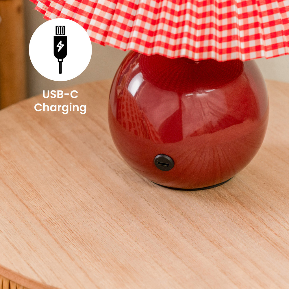 Our cordless burgundy lamp adds a pop of colour to your home and makes a real statement in your personal space. The ceramic base comes complete with a gingham tapered shade. Featuring a touch button to turn the warm white light on/off and dim the light brightness. Simply charge the lamp and use it anywhere. This rechargeable lamp comes complete with a 1M USB charging cable. Please Note - The recommended charging time for full charge is 5 hours to get 7 hours glow time.