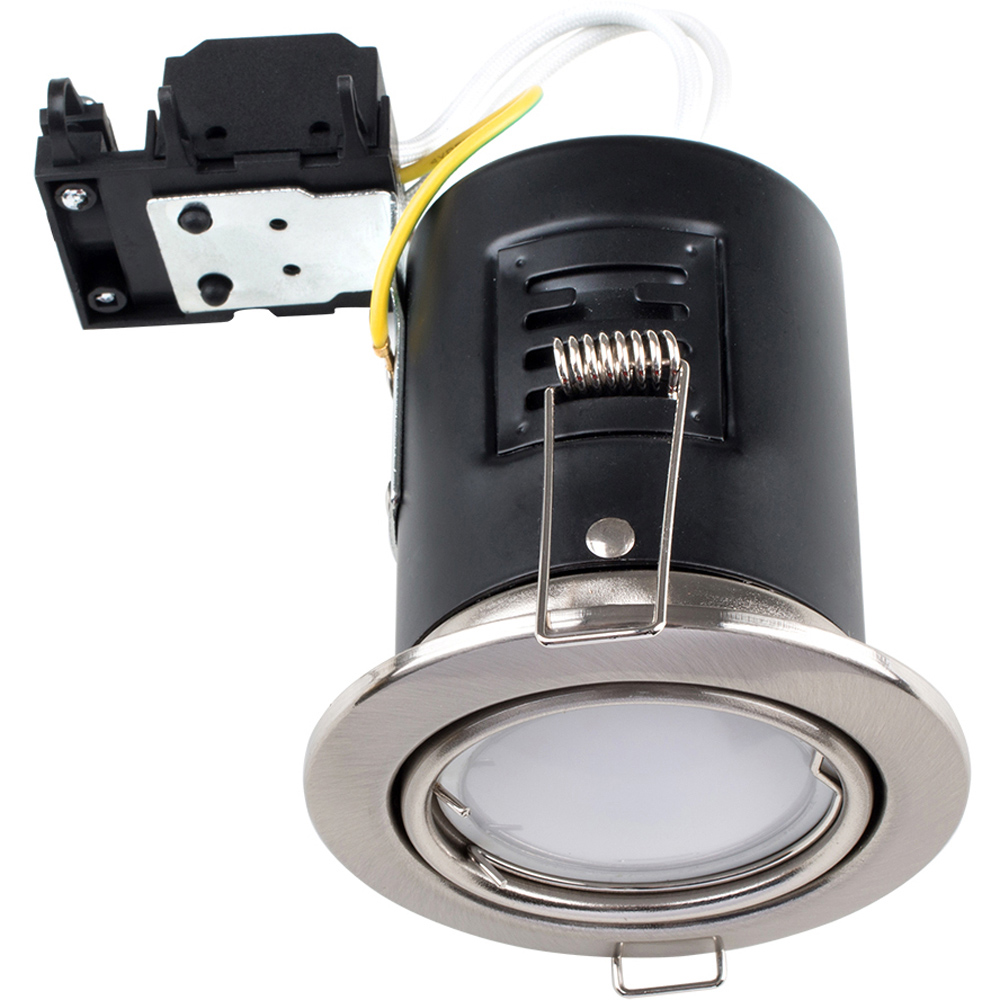 Pack of 10 quality mains GU10 tiltable fire rated recessed downlights that come in a choice of finishes, including Brushed Chrome, Black Chrome, White and a standard Chrome. These come complete with terminal block, GU10 lampholder and bracket for installation. They feature a metal spring clip for easy installation, and there is no transformer required - simply wire directly to the mains. Supplied with product guidelines and full fitting instructions, and suitable for use with either regular halogen or LED GU10 bulbs. This kit includes Cool White LED GU10 bulbs. Dimensions - height 11cm x width 10.5cm x depth 10.5cm.