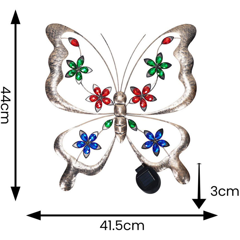 Brighten up your outdoor space with the Butterfly Solar Outdoor Multi Coloured Wall Art Garden Fence Ornament Light, a delightful blend of art and functionality. This circular metal solar butterfly wall art transforms your garden into a whimsical paradise. By day, it serves as a captivating decorative piece with its intricate metalwork, and by night, it emits a soft, enchanting glow, all powered by solar energy. Installation is effortless with no wiring needed; simply hang it up, let it charge during the day, and enjoy the magical illumination it brings to patios, fences, or any outdoor area.