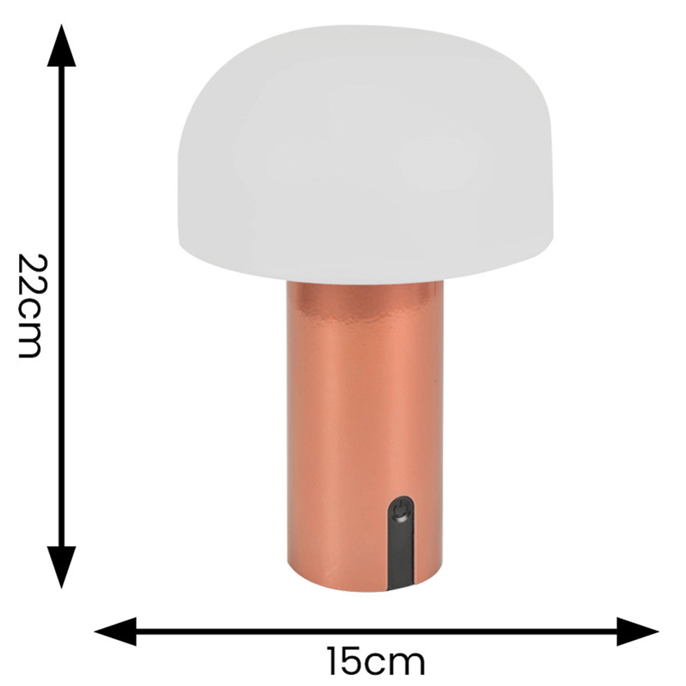 Elevate your space with the ValueLights Calhoun Copper Rechargeable LED Mushroom Table Lamp. This versatile lamp is perfect as a reading light, bedside lamp, or decorative outdoor light. It comes with a built-in rechargeable battery, allowing you to place it anywhere in the room without needing a socket. You can also charge it with the USB plug, then touch the switch to turn it on or off or hold it to adjust the brightness. The lamp features a trendy mushroom design and is available in a copper finish, emitting a warm white glow. Please note that it takes at least four hours to fully charge the lamp, providing eight hours of glow time. To prolong the battery life, it is recommended to charge the lamp at least once a month.