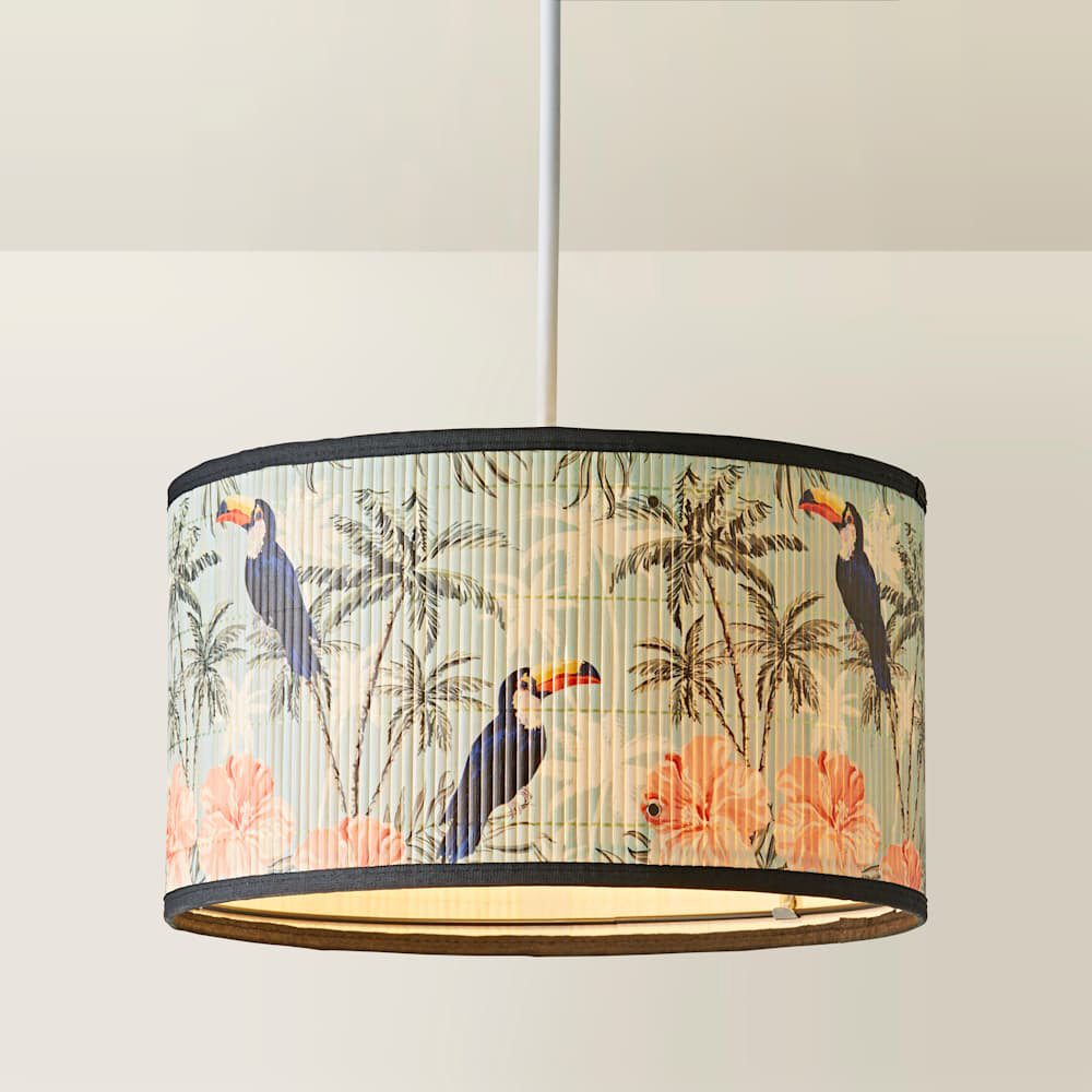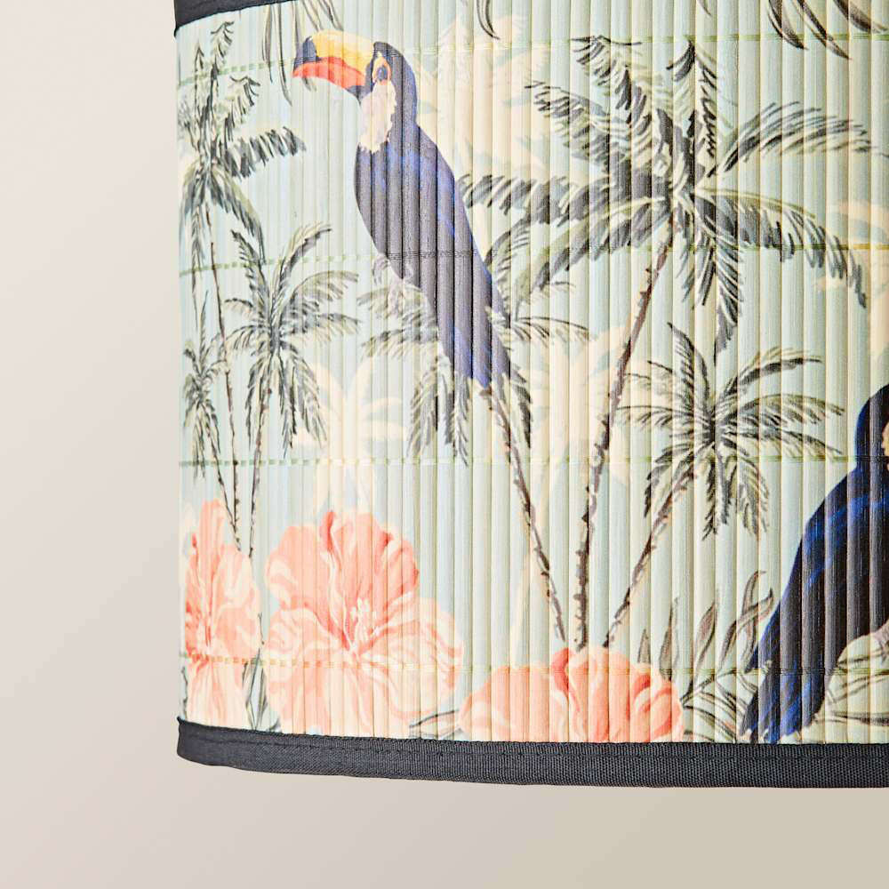 Add tropical flair to your home with the Daintree Pastel Jungle Bamboo Drum Shade. Featuring a bold toucan print and 1920s-inspired glamour, this versatile lampshade fits ceiling, table, or floor lamps thanks to its reversible gimbal. Easy-fit and flat-pack ready, it’s quick to install and perfect for stylish, colourful interiors. Ideal for modern, vintage, or eclectic décor, this shade is available in both small and large sizes. Bulb not included, available separately. Size: H20 x W35 x D35cm.