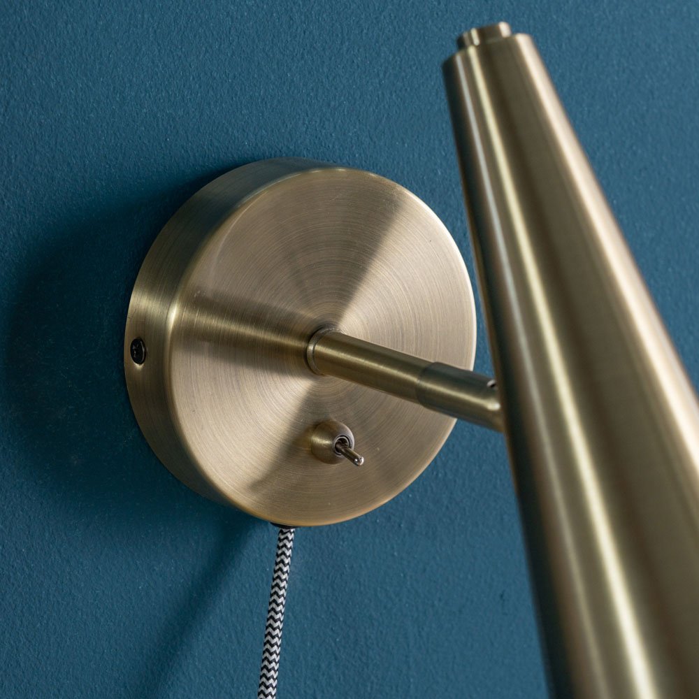 Suiting any living room, bedroom or reading nook this plug in wall light features statement metal in a brushed antique brass finish. Perfect for a classic look that will fit in with both modern and traditional interiors. This timeless design light features an adjustable cone head which makes it easy to direct the light where required. The perfect task lamp for use in your home office, student accommodation, for reading, homework, and other tasks. Dimensions - H17 x W10 x D21cm.