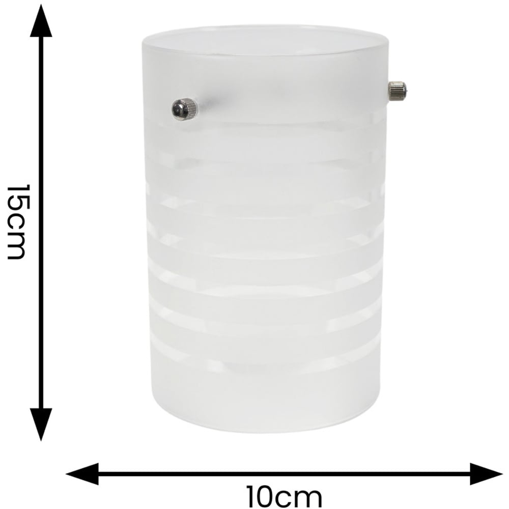 Sleek and sophisticated, the ValueLights Elsie Frosted Glass Striped Small Cylinder Lamp Shade brings an understated elegance to any room. Its cylindrical shape and frosted glass finish give off a soft, gentle glow, while the clear glass stripes create a captivating light pattern. With its modern lines and stylish design, this lamp shade is a great fit for contemporary homes, enhancing your décor with a bit of class.