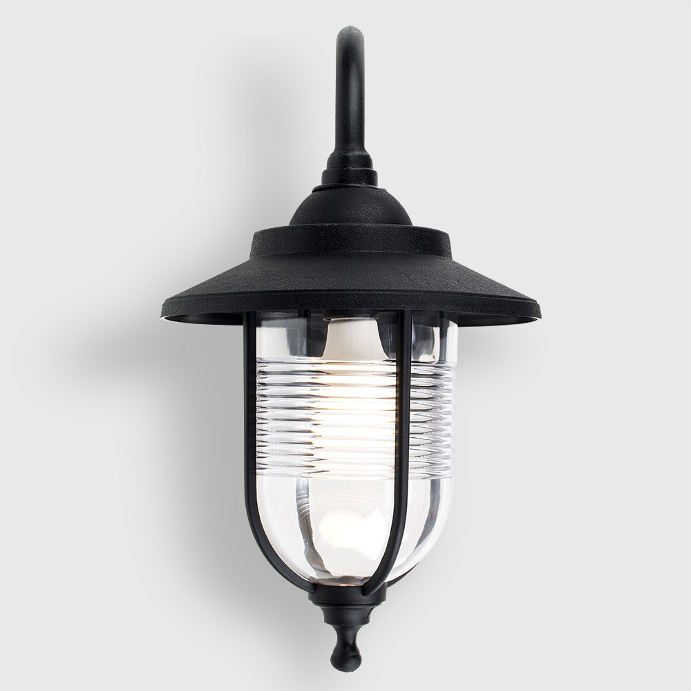 Revamp your outdoor area with the ValueLights Eyam Black Outdoor Swan Neck Wall Lantern. This traditional-style fisherman's wall lamp comes in a sleek black finish and is built from durable, weather-resistant resin with a clear shade. It's perfect for illuminating gardens, patios, courtyards, driveways, porches, conservatories, or for indoor use. Rated IP44, it's fully certified for outdoor installation. The light comes with a six-watt warm white LED bulb, so you're all set for installation right out of the box.