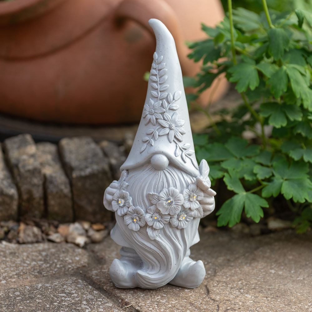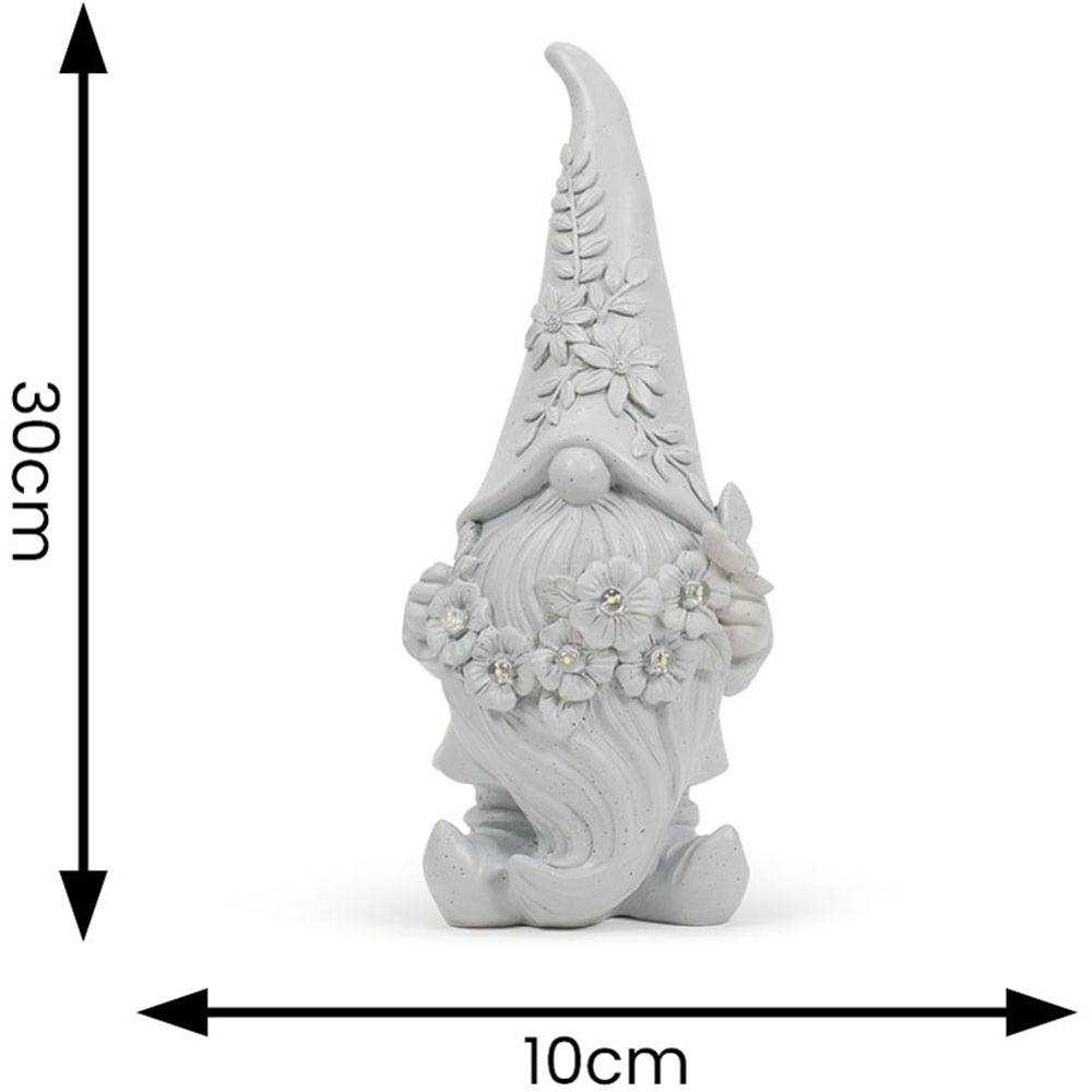 Add fun to your garden with the ValueLights Flower Gonk Solar Garden Ornament Light. This light illuminates your outdoor area and features flowers, each with a solar light in the middle. This beautiful ornament is the perfect decorative lighting effect for your outdoor space with an integrated solar panel and a grey finish. Place it where the sun shines during the day, and get the shining sun in your garden even when it goes down. This garden ornament transforms your garden into an elegant retreat, embracing the beauty of the night.