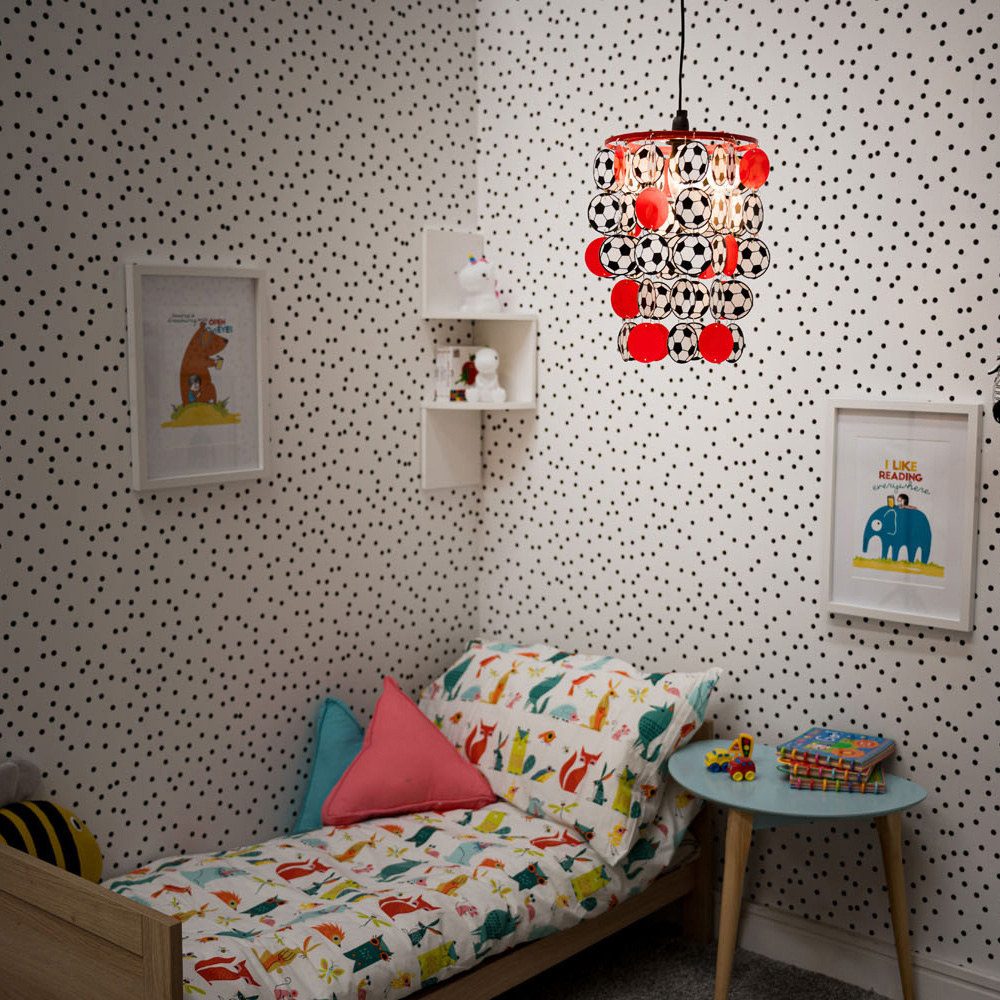 Upgrade your athletic room decor with the ValueLights Football Red and White Droplet Ceiling Pendant Lamp Shade. This lampshade is ideal for a children's room or nursery, adding a sporty vibe to the space. It easily fits an existing lamp holder and transforms a room in seconds with no electrical installation required. This lampshade features several footballs cascading down like a chandelier and boasts a height of 32cm with a diameter of 23cm.