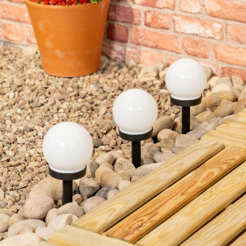 Brighten your garden with the mystical charm of these Frosted Globe Solar Powered Outdoor Spike Lights! This three-pack offers an eco-friendly way to illuminate your outdoor spaces, effortlessly transforming them into enchanting orbs of light as dusk falls. By day, these lights discreetly charge using solar power, and by night, they emit a soft, guiding glow that ensures you'll never stumble on your way to the shed again. With no wiring required, installation is a breeze simply stake them into the ground and enjoy the enhanced ambience and safety of your garden paths and flowerbeds.