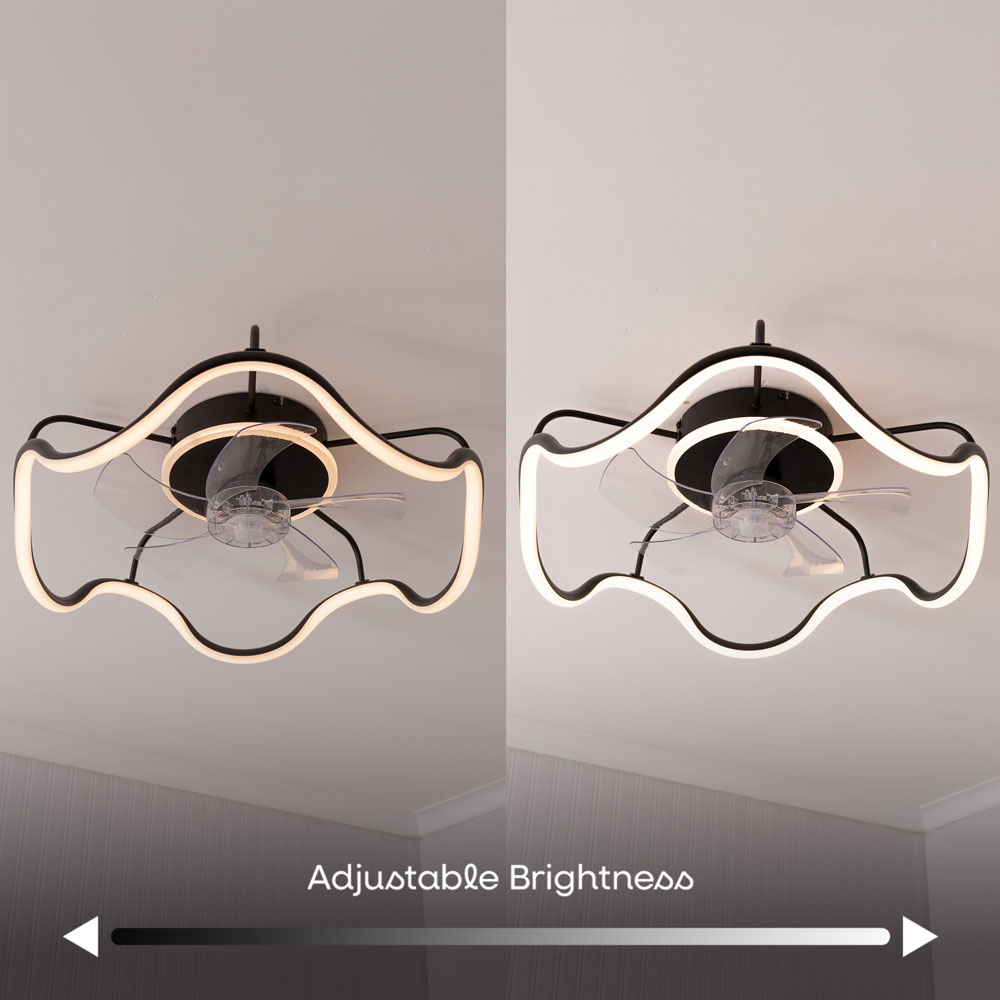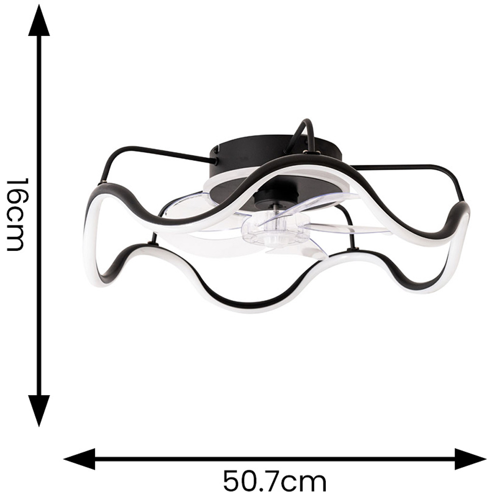 This ceiling fan is aesthetically pleasing and practical, ideal for any modern home. Crafted from sleek black metal with five clear blades, this integrated LED fan comes complete with a remote control where you can simply choose from three speed options, increase, or decrease brightness levels. There are timer functions and the option to dim the light from 100%, 50% or use the night light setting, all controllable through the included remote control. The light gives off a warm white glow, whilst the fan features a powerful but quiet motor to create a peaceful, cosy, and comfortable living environment. Use this fan to add a stylish touch to any room while also enjoying its functional features. The fitting comes assembled, making the process of installation much simpler. Dimensions: H15 x W53 x D53cm.