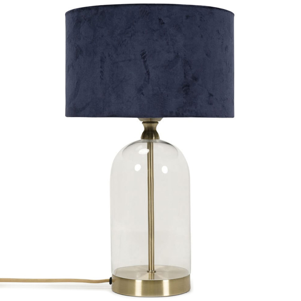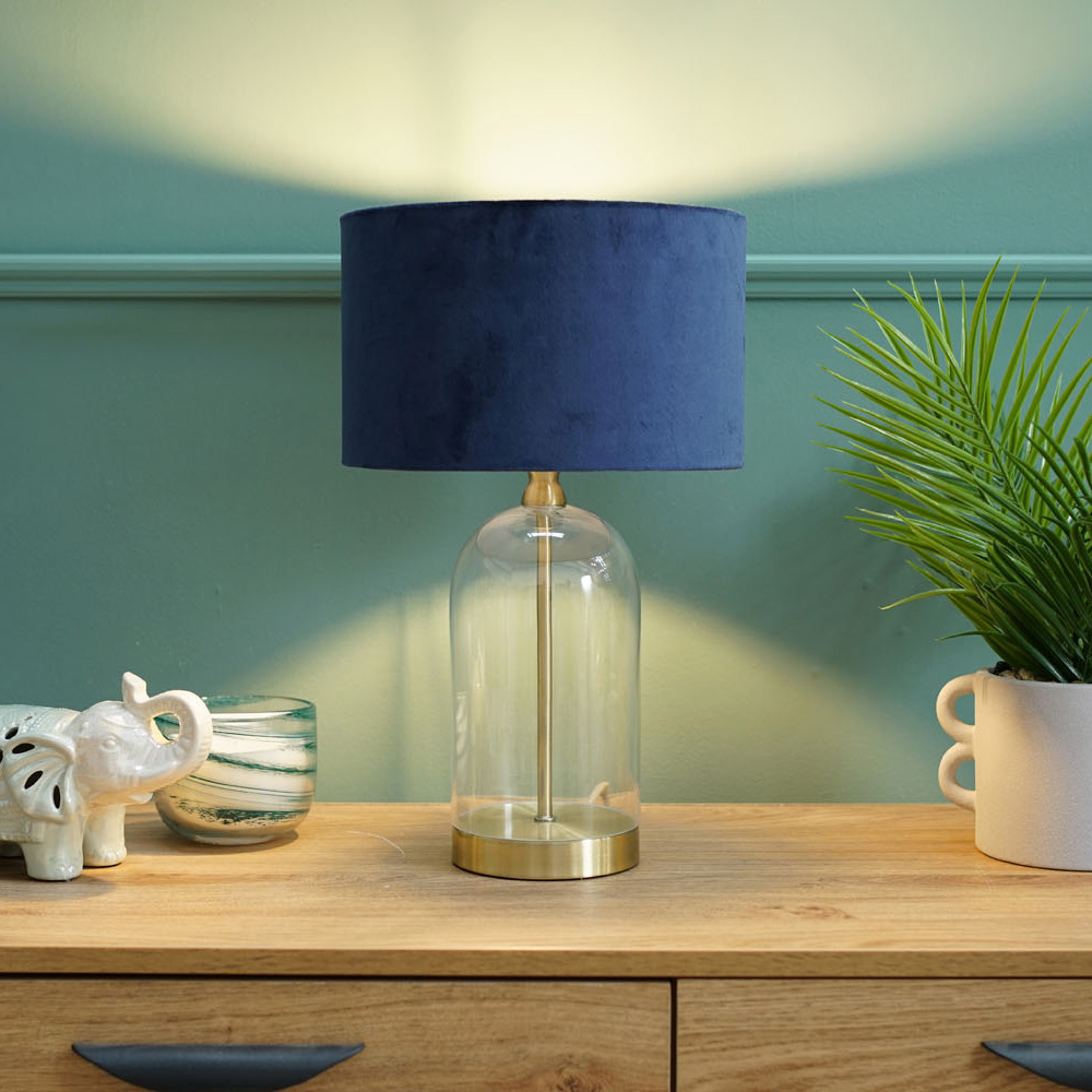 Add a timeless addition to your home with this stunning table lamp base, made of clear glass with gold trim finishing. Featuring a glass base with a simple, modern design that complements any décor. Whether your style is a vintage, or sleek and minimalist, this lamp will fit perfectly into any room in your home. Paired with navy blue velvet drum lamp shade for the perfect finish.