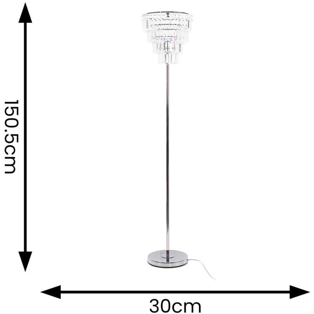 Meet the Kelsks floor lamp – your new glow-up companion with a glam twist. Featuring three tiers of clear acrylic jewel-effect droplets cascading from a chrome frame, it brings serious sparkle to any corner. The upright design adds height and elegance, while the dazzling droplets reflect the light beautifully. Just plug it in and let the shimmer do the talking. Perfect for bedrooms, lounges or anywhere that needs a touch of luxe. Dimensions: H150 x W30 x D30cm.