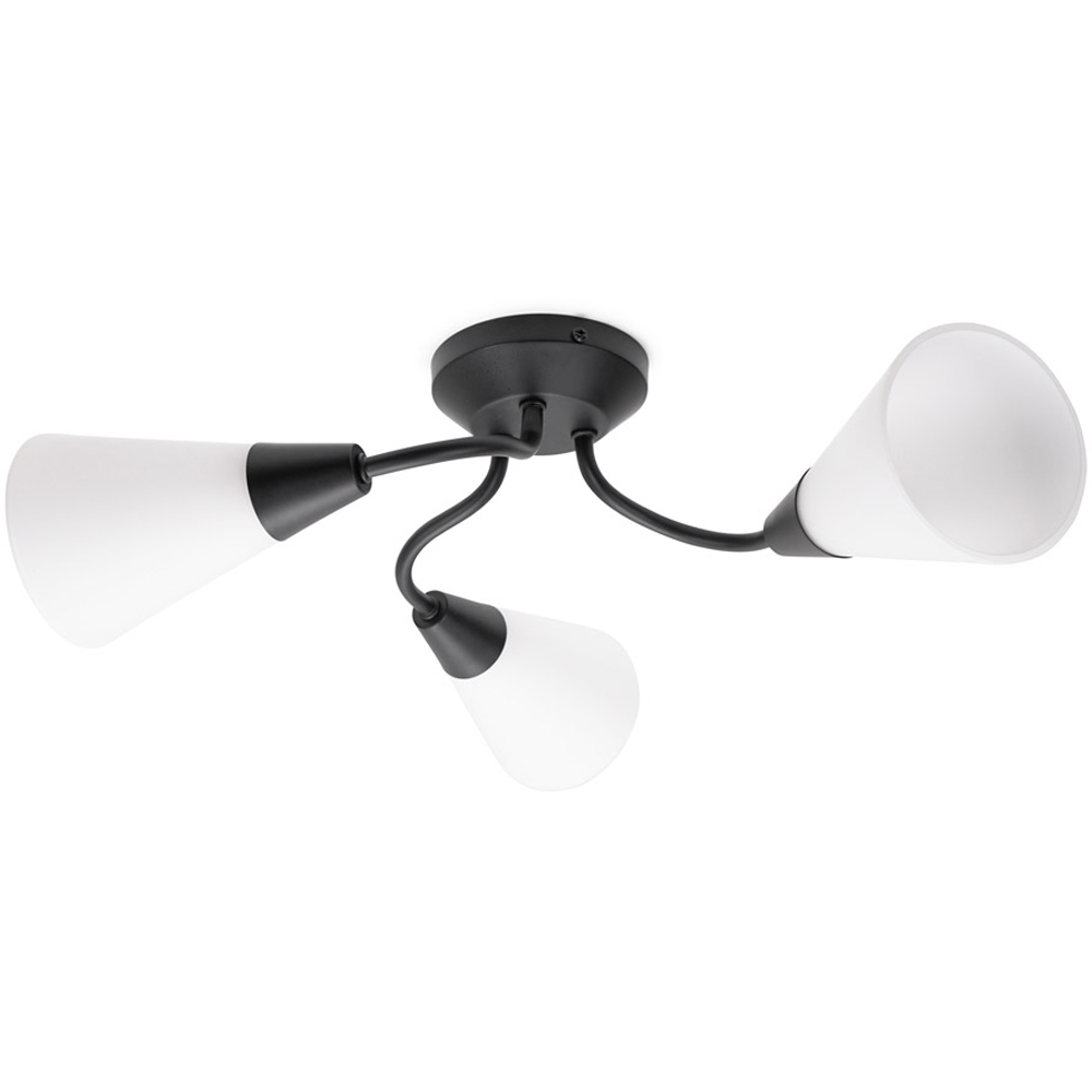 Revitalise your home décor with the ValueLights Kristina 3 Way Frosted White Shade Black Metal Flush LED Ceiling Light. This three-way ceiling light in black colour delivers triple lighting power and a bit of shine to any space. With its three shades, this lamp provides a multi-dimensional illumination that brightens and uplifts any room décor. Designed in a flush style, this light casts a warm light that uplifts the depth of your space. Each of its three arms is adorned with white frosted shades, which diffuse the light beautifully, creating a soft and inviting glow. With its stylish black finish and versatile flush design, it offers both aesthetic appeal and practical illumination. Plus, to keep it clean, wipe the surface gently with a dry cloth. It also includes a 12-month warranty.