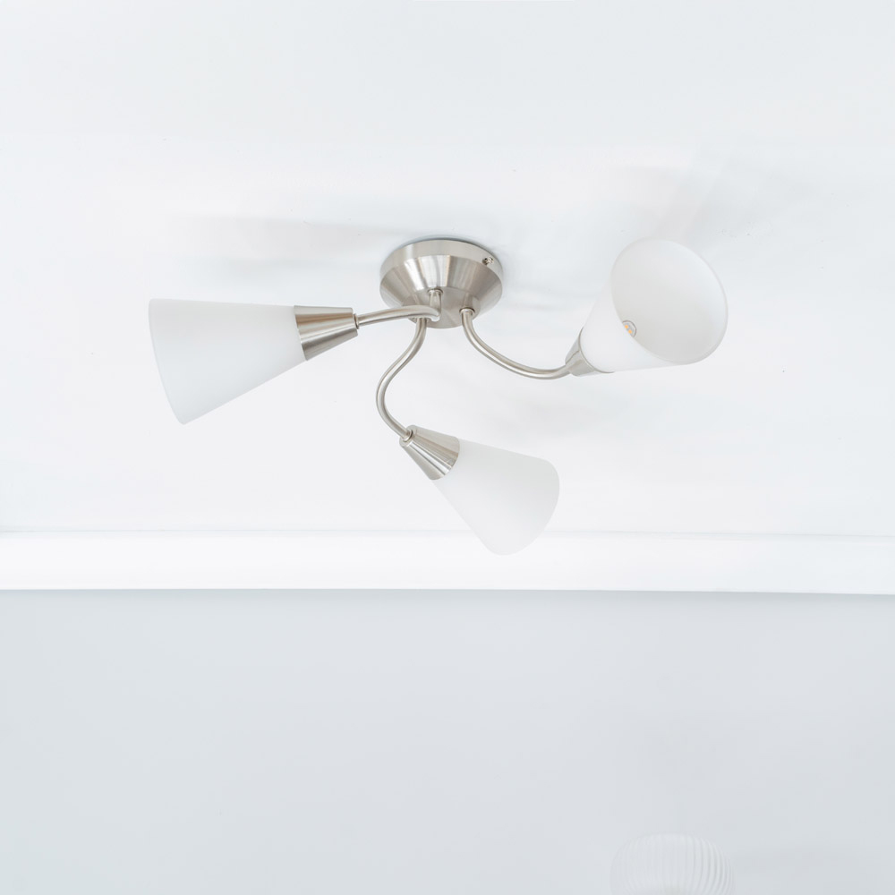 Revitalise your home décor with the ValueLights Kristina 3 Way Frosted White Shade Silver Metal Flush LED Ceiling Light. This three-way ceiling light in silver colour delivers triple lighting power and a bit of shine to any space. With its three shades, this lamp provides a multi-dimensional illumination that brightens and uplifts any room décor. Designed in a flush style, this light casts a warm light that uplifts the depth of your space. Each of its three arms is adorned with white frosted shades, which diffuse the light beautifully, creating a soft and inviting glow. With its stylish silver finish and versatile flush design, it offers both aesthetic appeal and practical illumination. Plus, to keep it clean, wipe the surface gently with a dry cloth. It also includes a 12-month warranty.