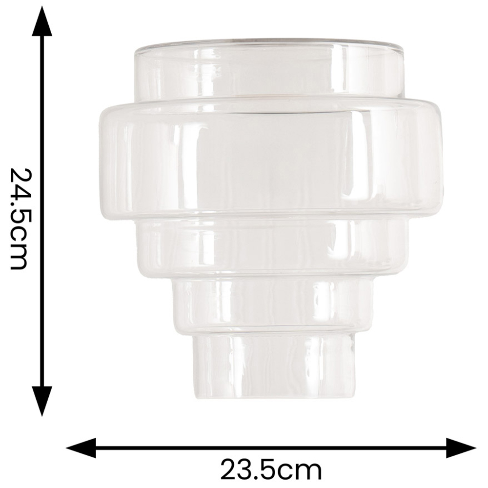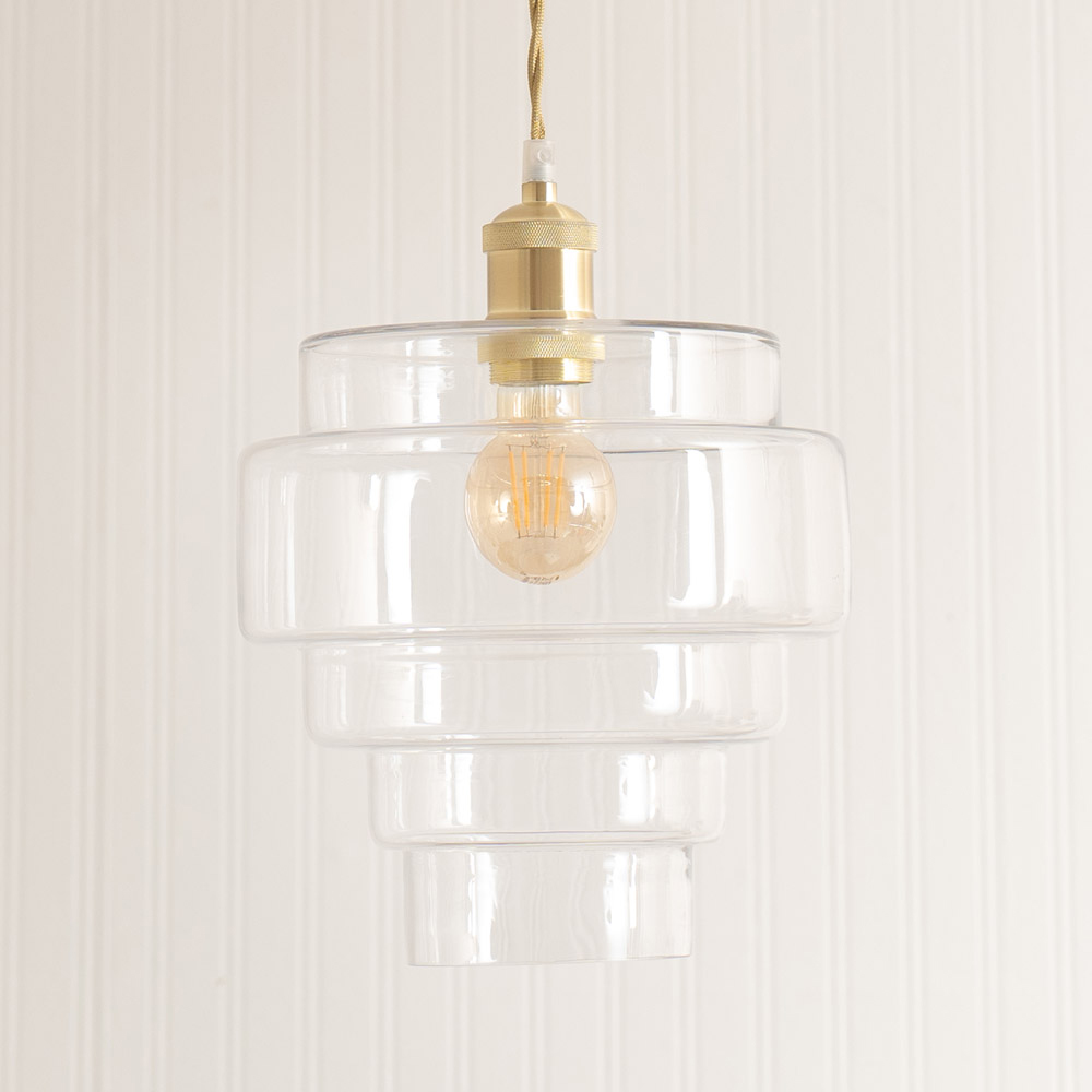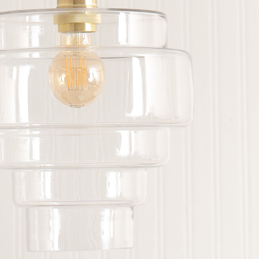 Introducing Lane, the epitome of layered elegance in lighting, this clear glass 5-tier ceiling pendant lamp shade brings a sophisticated glow to any room. With its minimalist design, Lane allows light to cascade through each tier, creating an atmospheric illumination that's both chic and captivating. Perfect for those seeking a statement piece that combines modern simplicity with classic luxury, Lane effortlessly enhances your home's ambiance.