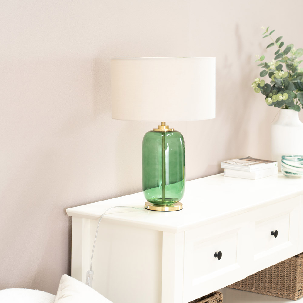 Make a classic and functional addition to your home decor with the ValueLights Leigh Reni Natural Shade Forest Green Glass LED Table Lamp. It features a natural fabric Reni shade with a glass lamp base and an LED bulb. The glass lamp base reflects light in the room, enhancing your lighting scheme and the natural light effect. This elegant lamp has a beautiful gold trim and can be wiped with a clean dry cloth for easy maintenance. This table lamp comes with a one-year warranty.