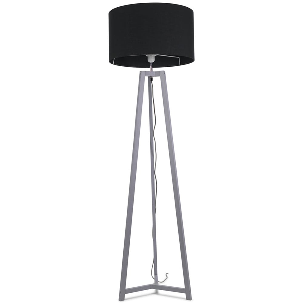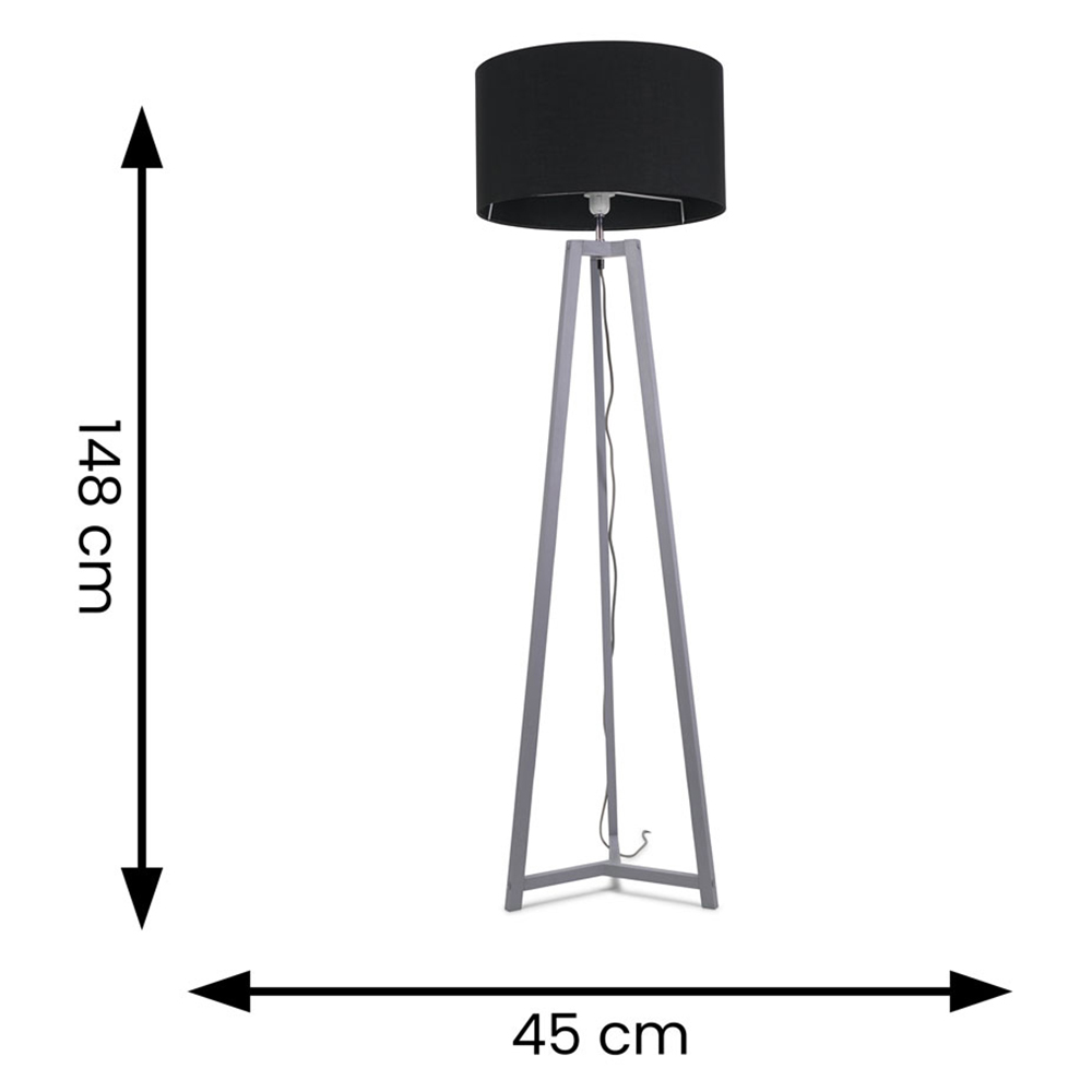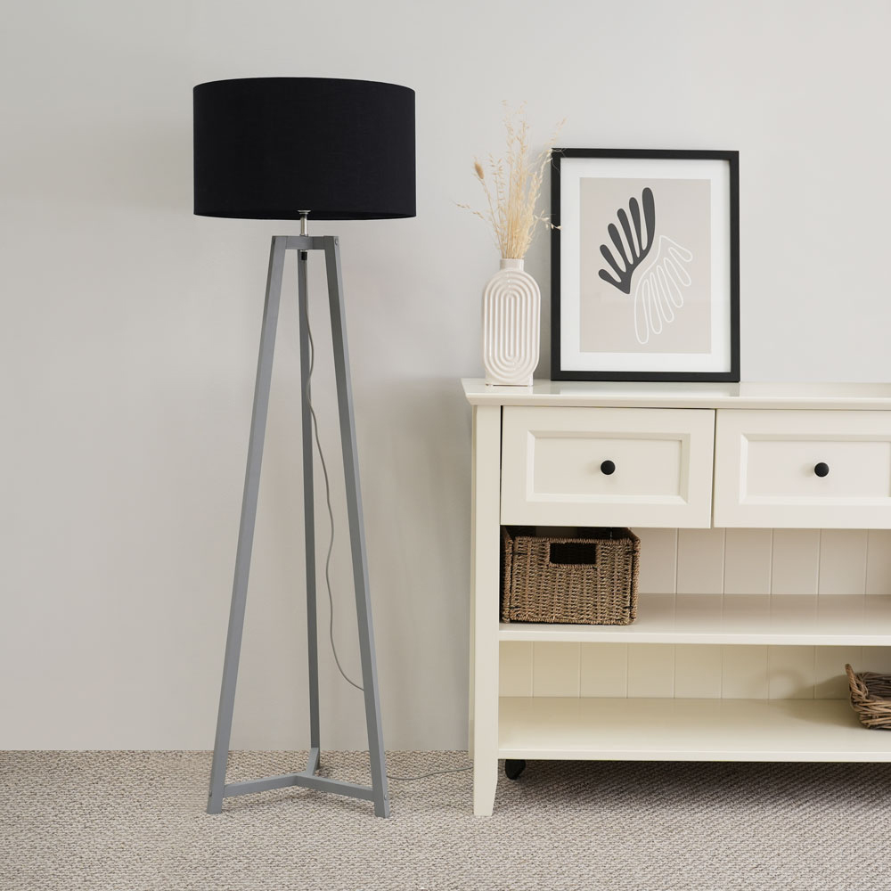 The Lottie tripod floor lamp in grey wood is the perfect neutral base for this black fabric drum shade. The grey wood base adds a chic and modern feel to any home.