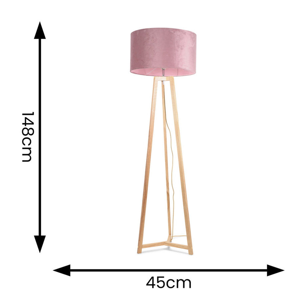 ValueLights Lottie Blush Pink Velvet Drum Shade Natural Wood Tripod LED Floor Lamp