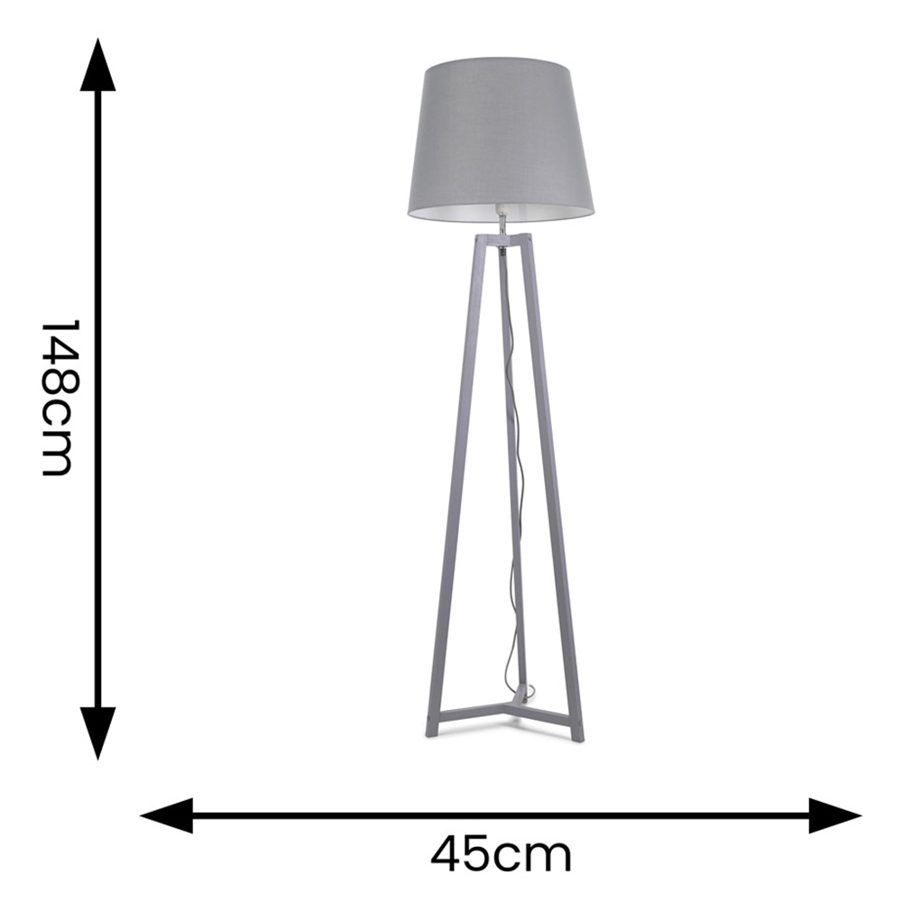 The Lottie tripod floor lamp in grey wood is the perfect neutral base for this grey fabric tapered shade. The grey wood base adds a chic and modern feel to any home.