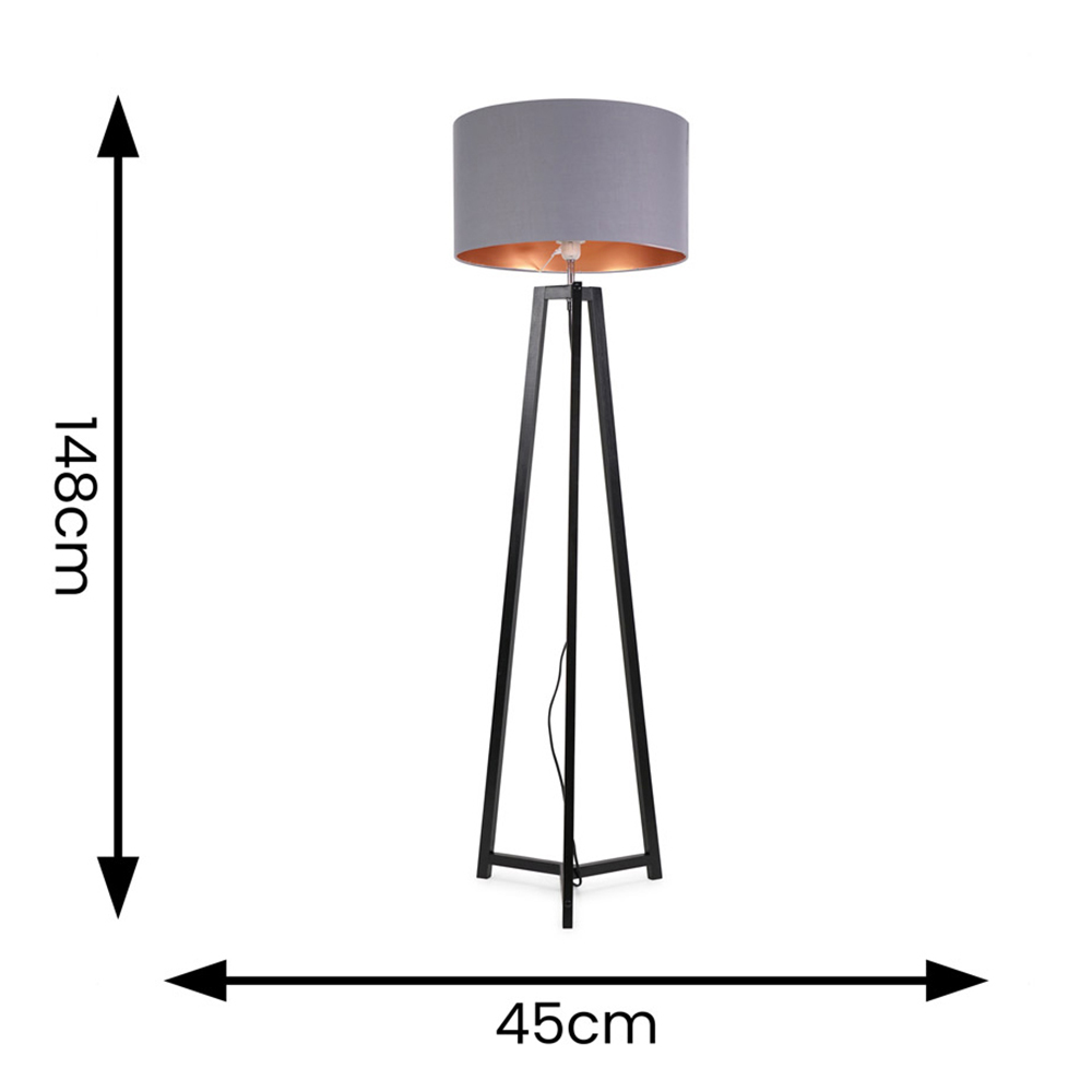 The Lottie tripod floor lamp in black wood is the perfect neutral base for this black and gold drum shade. The black wood base adds a chic and modern feel to any home.