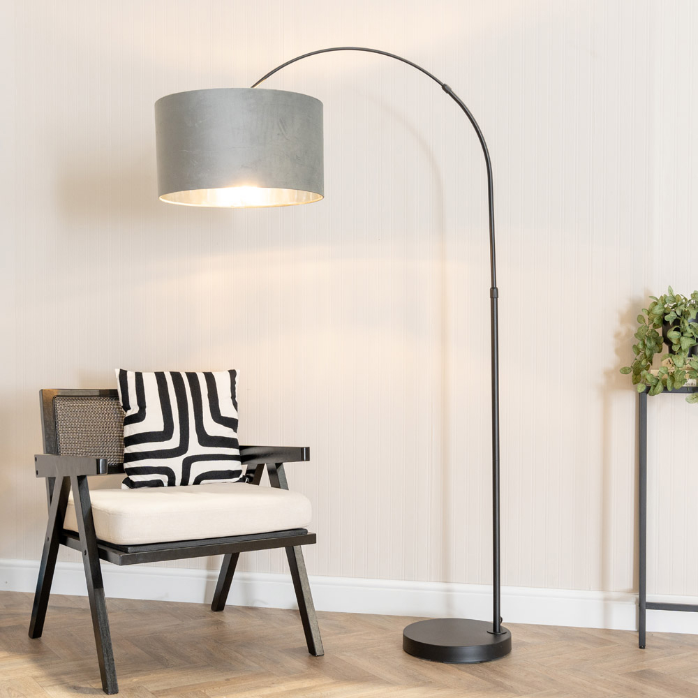 ValueLights Louis Black Arched LED Floor Lamp with Grey and Chrome Velvet Drum Lamp Shade