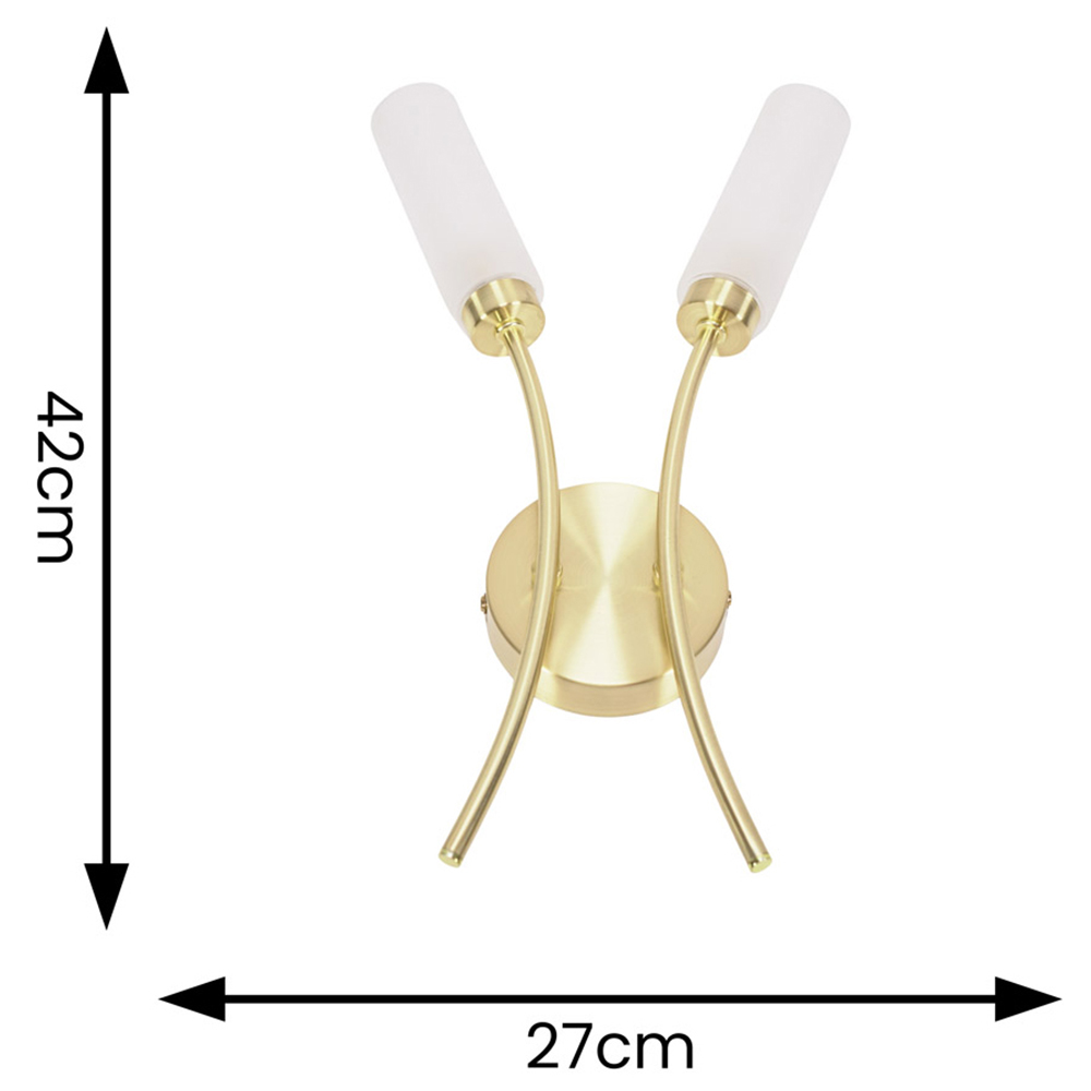 Enhance the beauty of your home decor with the ValueLights Maya 2 Way Brushed Gold Curved Upright Reed Shaded LED Wall Light. This contemporary style wall light resembles the traditional wall candle holder design. This wall light features two long shades with two curved stems attached to a stable base. It comes with LED bulbs to enhance and brighten up your interior space. It has a smooth finish and can be wiped with a clean dry cloth for easy maintenance. This wall light comes with a one-year warranty.