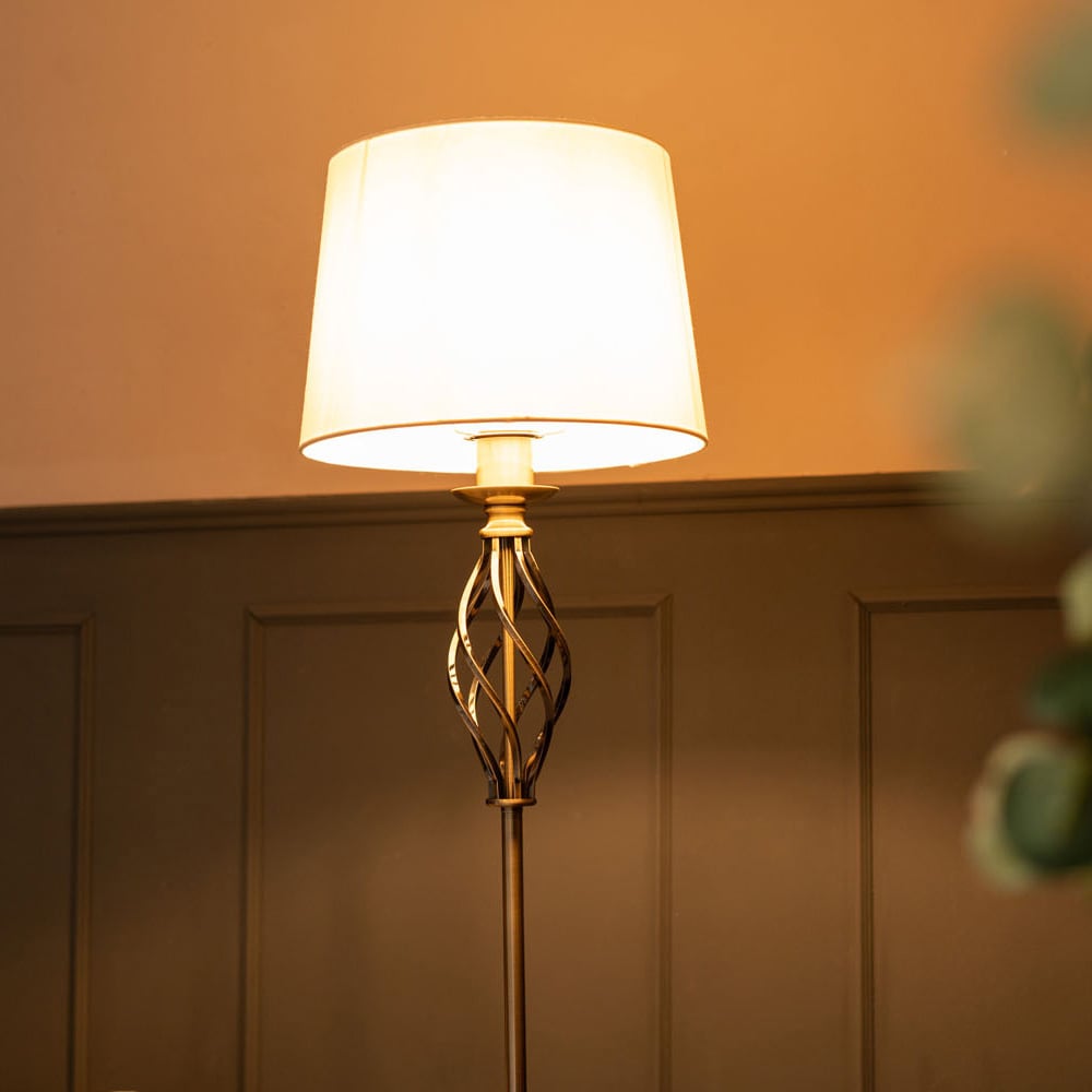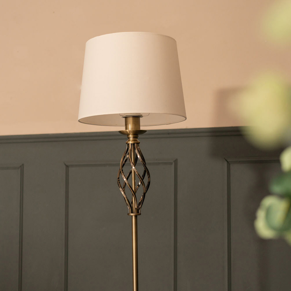 Brighten up your living space with this elegant floor lamp collection. Statement metal combines with a fabric shade for a classic look that will fit in with both modern and traditional interiors. With a twisted design base and a timeless neutral tapered shade, ready to class up any interior.