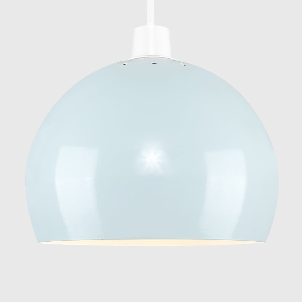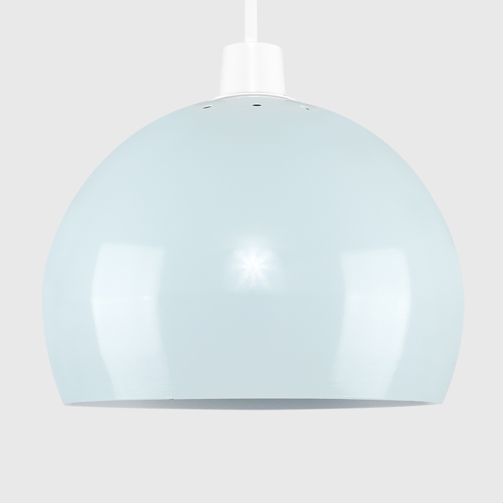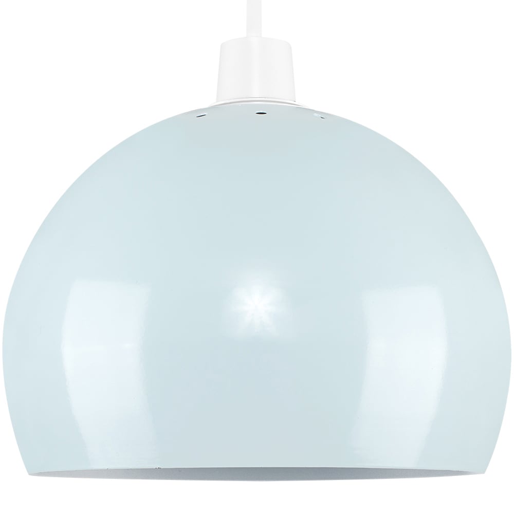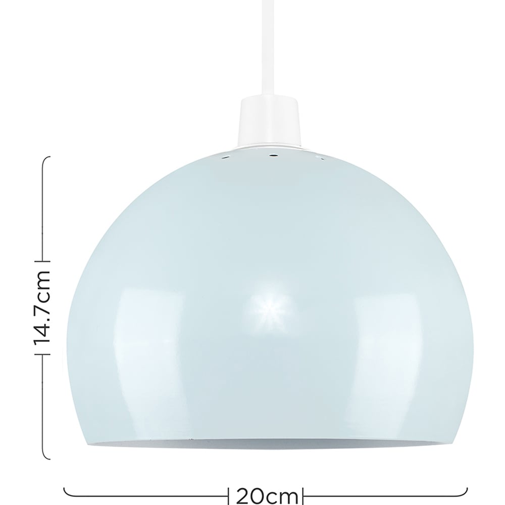 Elevate your living space with the ValueLights Pale Blue Arco Mini Metal Pendant Light Shade. This miniature retro light, reminiscent of a New York coffee house, features a sleek pale blue finish and a modern arco dome shape. It's perfect for kitchens, dining areas, living rooms, bedrooms, and hallways. Plus, it can be easily installed in a standard light socket without any need for electrical wiring. The dimensions are H14.7 x D20cm.