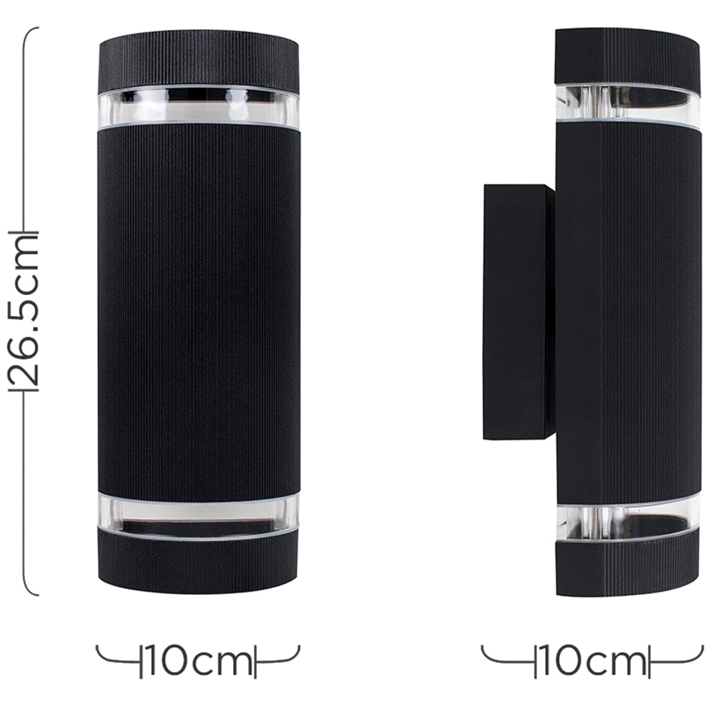 Enhance your garden aesthetics with the ValueLights Ryston Black Cool White Bulb Wall Up-Down Light. This modern curved ribbed effect aluminium wall light fitting comes in a matt black finish. The fixture has a stylish contrasting clear glass light shade, allowing the light to disperse evenly from the top and bottom. With an IP54 rating, this light is fully certified for outdoor installation and is weatherproof. It is an ideal product to help create a warm and inviting glow on doorways, porches and external walls. It is also an elegant way to add security to your home, as well as outdoor decorative lighting. It comes with a set of 5W cool white LED bulbs for ready-to-install and go.