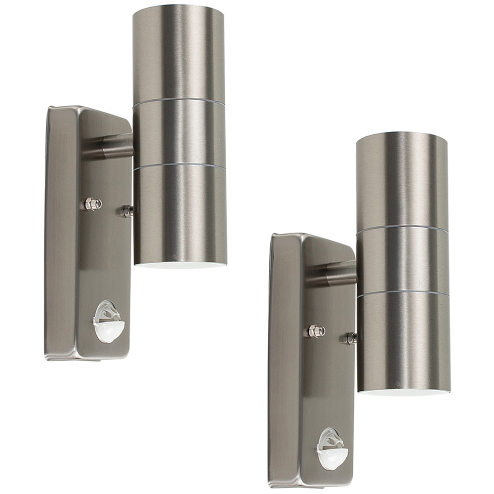 Enhance your garden aesthetics with the ValueLights Set of 2 Silver Warm White Bulb PIR Wall Up-Down Outdoor Lights. This pair of modern, stainless steel outdoor wall lanterns creates a warm and inviting glow to doorways, porches and external walls. These stylish, wall-mounted, up / down outdoor lights add security to your home. They are perfect for gardens, driveways, patios and garages. These external lights also feature a practical integrated PIR motion detector for added security. The light emits from the top and bottom of this IP44-rated, fully certified for outdoor installation and weatherproof lamps. They come with a set of 6W warm white LED bulbs for ready-to-install and go.