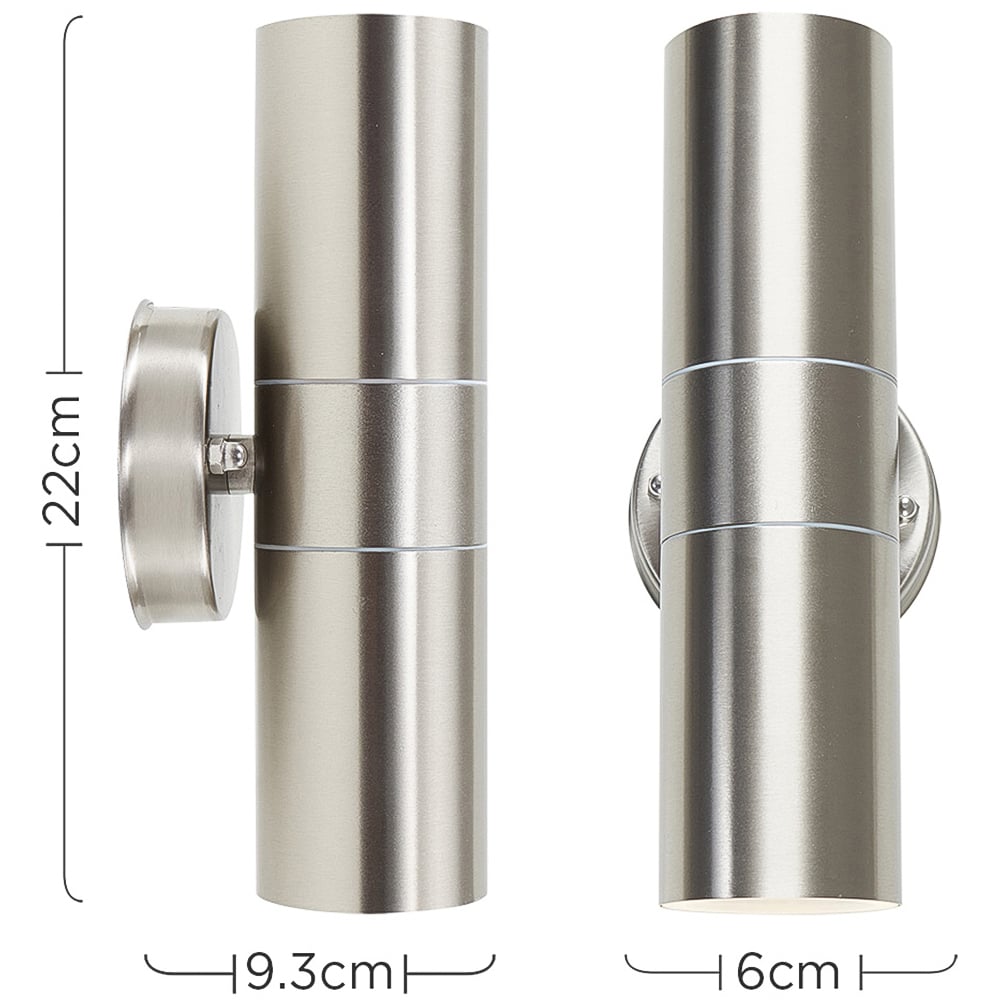 Update your outdoor space with the ValueLights Silver Outdoor Wall Up Down Light with Dusk till Dawn Sensor. This modern stainless steel outdoor wall lantern is designed to provide a warm and inviting glow to doorways, porches, and external walls. It's also a stylish way to enhance security for your home, making it perfect for gardens, driveways, patios, and garages. The light emits from the top and bottom of the IP44-rated weatherproof lamp, which is fully certified for outdoor installation. The light comes equipped with ValueLights Branded three-watt dusk to dawn LED sensor GU10 light bulbs. These bulbs automatically switch on as the ambient light drops below ten lux (dusk) and switch off as the ambient light reaches 15 lux (dawn). This feature eliminates the need to worry about forgetting to switch the outside light on or off and helps you save on energy costs. This bulb provides effective security lighting, offering a practical solution for your needs.