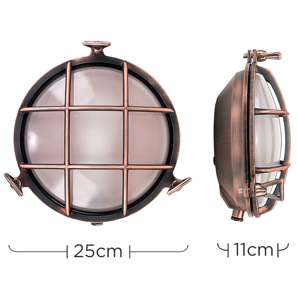 Transform your outdoor space with the ValueLights Stern Copper Outdoor Wall Bulkhead Light. These nautical-style circular dome outdoor wall lights have a sleek copper effect metal finish casing. With an IP64 rating, you don't need to worry about weather or rain damage, making it suitable for bathrooms or outdoor use. Perfect for outdoor walls, garages, porches, and patios. It comes with a four-watt LED bulb, making it ready to install and use.