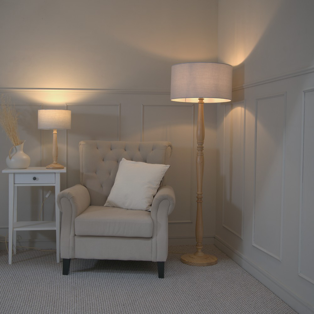 The Victoria candle stick table lamp in light wood is the perfect choice for any home with a traditional interior. Perfect to pair with a grey drum shade for your perfect piece.