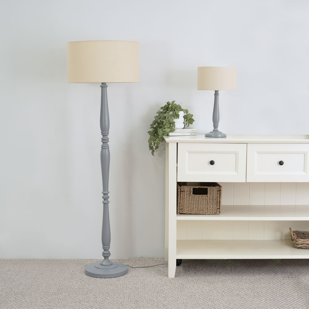 The Victoria candle stick table lamp in grey wood is the perfect choice for any home with a traditional interior. Perfect to pair with a natural drum shade for your perfect piece.