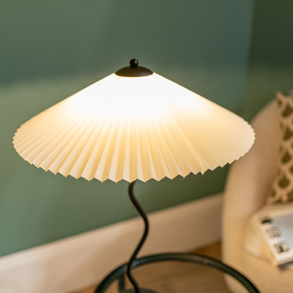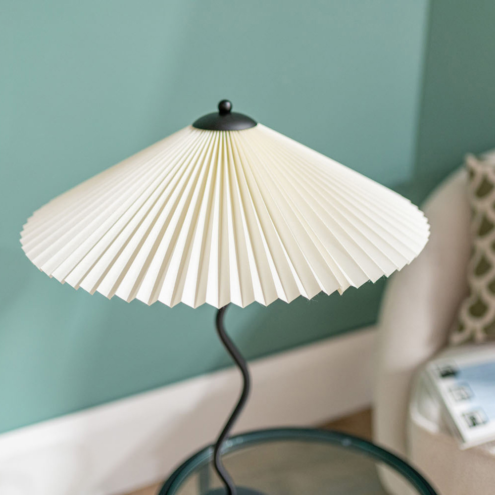 Add a touch of unique style and character to your home with this waved black metal stem table lamp base. The in-line switch provides convenient control, making it easy to illuminate your space. Elegantly crafted, this wiggle design lamp is perfect for illuminating any room in your home, and is paired with a white origami paper pleated lamp shade to complete the look.