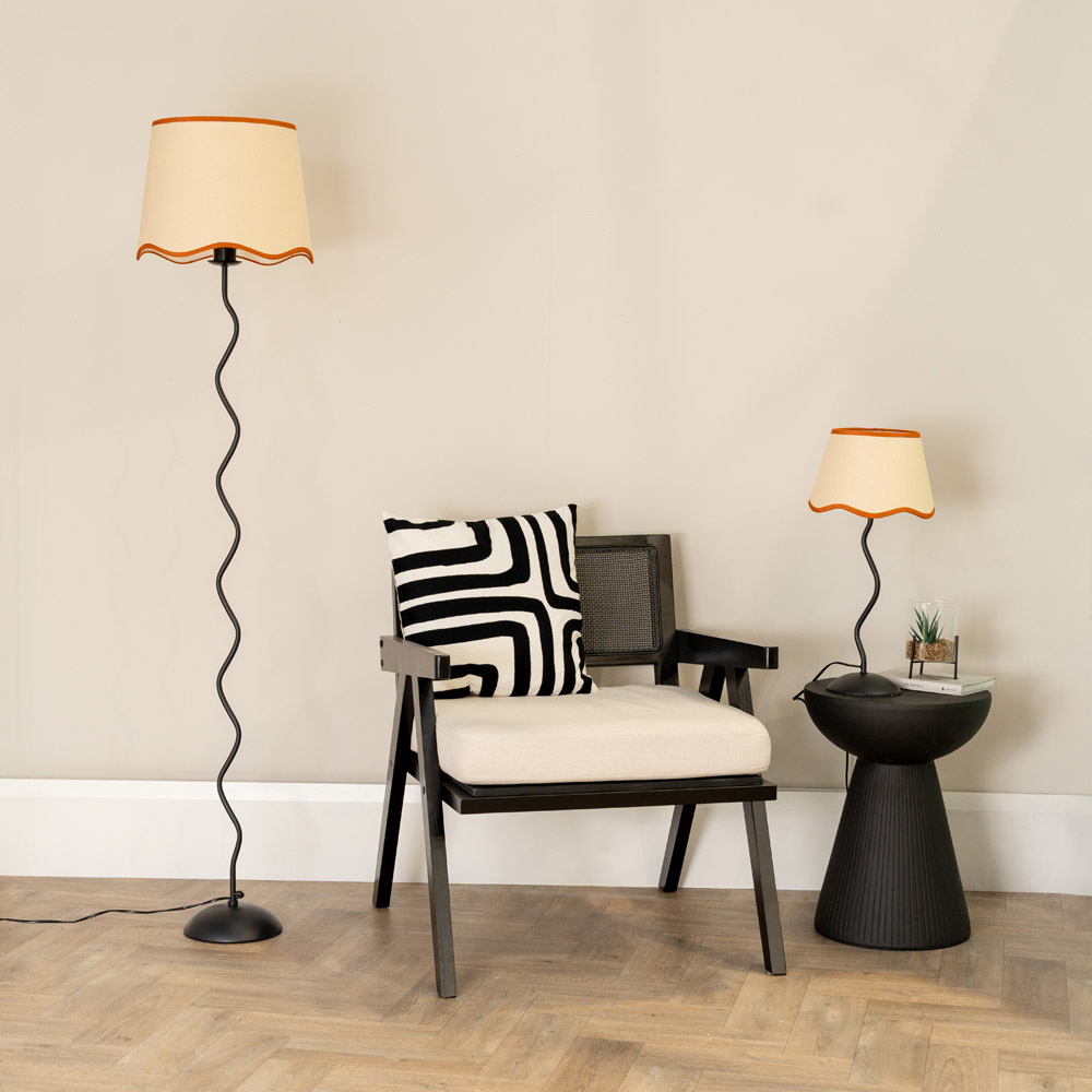 Make a quirky addition to your living space with this ValueLights Wiggle Floor Lamp. Its black metal base boosts the style points in any interior, and it’s paired with a natural colour scalloped linen shade with contrasting rust trim. The shape of the scalloped edge shade mirrors the wiggle lamp base perfectly, giving you a design piece as well as a modern floor lamp. Complete with a suitable LED bulb and a 12-month warranty for peace of mind, the ready-to-use lamp is the perfect statement piece for any contemporary decor theme. Dimensions: H160 x W35 x D35cm.
