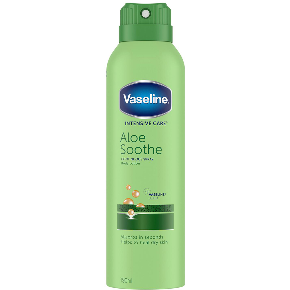 Vaseline Intensive Care Spray Moisturiser, Aloe Soothe, 6 Pack, 190ml is designed for women who are pressed for time but still want effective moisturisation. Vaseline spray lotions are designed for easy application and even all-over coverage. The unique formula moisturises deeply and absorbs quickly to help heal very dry skin and has a fresh aloe vera fragrance. An after-shower lotion like Vaseline Intensive Care Aloe Soothe Spray on body lotion is best for maximum moisturisation when you have limited time. Just spray on the non-greasy formula, rub it into the skin, and you're done. Vaseline Intensive Care Aloe Fresh spray moisturiser has a light, non-greasy formula which absorbs in seconds providing easy application. Non-aerosol, continuous spray lotion dispenses evenly for all-over coverage including areas that are hard to reach. Contains microdroplets of Vaseline Jelly to lock in moisture. Can be used as an after-shower lotion to lock in moisture. Instantly leaves skin soft & fresh, not greasy or sticky. Aloe is known to soothe and calm dry, irritated skin.