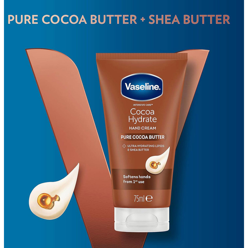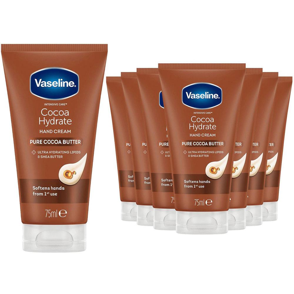 Vaseline Hand Cream Intensive Care Pure Cocoa Butter Cocoa Hydrate 75ml, 8 Pack is ideal for hands which are first to suffer from dry skin, constantly exposed to the sun, low humidity, and harsh cleansers that damage the skin's natural barrier. Care Cocoa Hydrate Hand Cream is designed to help relieve and soften dry hands after just one use. Formulated with ultra-hydrating lipids and shea butter, this moisturiser for dry skin helps to replenish moisture and fortify the skin barrier. It also contains pure cocoa butter and micro-droplets of triple-purified Vaseline jelly, which help to lock in moisture and form a protective layer on your skin. This sealing barrier speeds up your skin's natural recovery process. Vaseline Intensive Care Cocoa Hydrate Hand Cream contains pure cocoa butter and Vaseline jelly. Formulated with ultra-hydrating lipids and shea butter, this hand cream replenishes moisture and fortifies the skin barrier Helps soften dry hands from the first application. This nourishing hand moisturiser absorbs fast for a non-greasy feel, delivering hydration for healthy-looking skin. How to Use: Squeeze some Vaseline Intensive Care Hydra Replenish Hand Cream lotion from its travel-friendly tube and rub it on your hands until fully absorbed Ingredients: Aqua, Petrolatum, Glycerine, Stearic Acid, Isopropyl Palmitate, Glycol Stearate, Dimethicone, Triethanolamine, Glyceryl Stearate, Butyrospermum Parkii Butter, Theobroma Cacao Seed Butter, Cetyl Alcohol, Phenoxyethanol, Methylparaben, Parfum, Magnesium Aluminium Silicate, Carbomer, Propylparaben, Stearamide Amp, Disodium Edta, Caramel, Maltodextrin, Coumarin, Geraniol, Hexyl Cinnamal, Hydroxycitronellal, Linalool Box Contains: 8x Vaseline Hand Cream Intensive Care, 75ml.