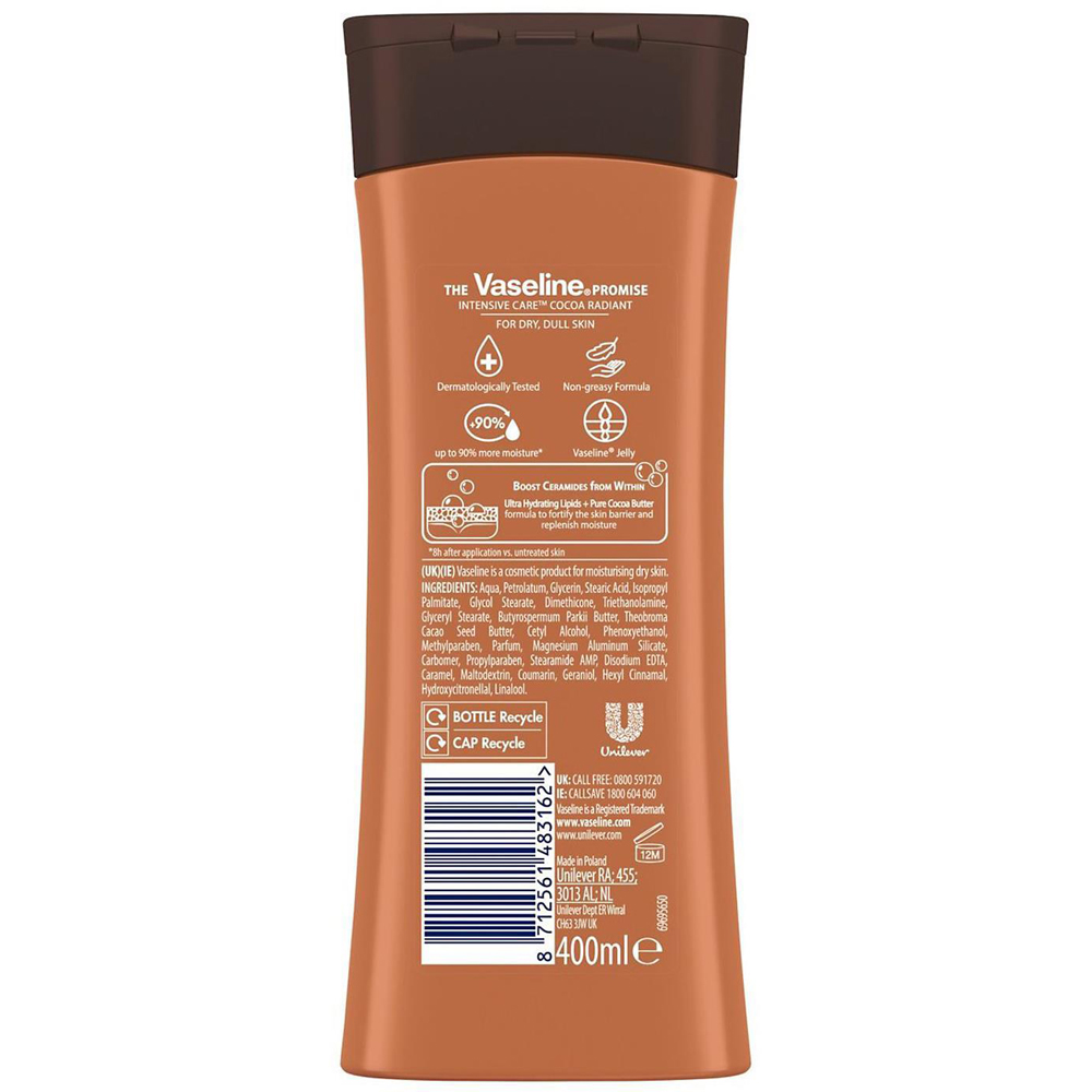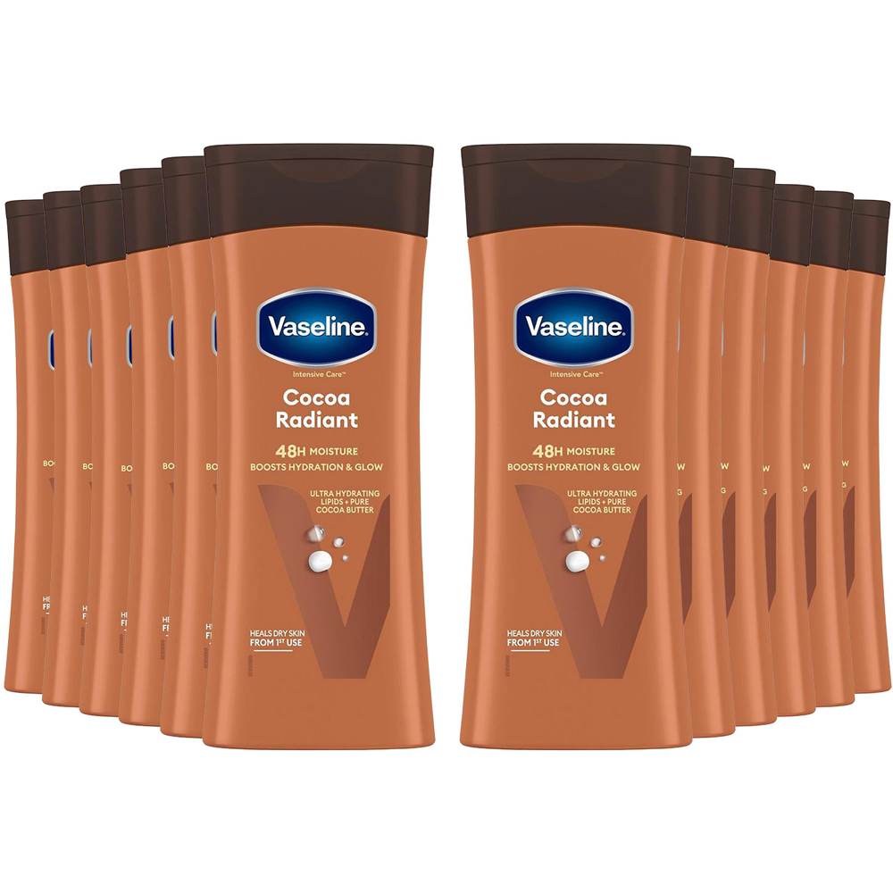 Vaseline Intensive Care Body Lotion Cocoa Radiant for Dry Skin 400ml, 12 Pack Vaseline Intensive Care Body Lotion contains micro-droplets of Vaseline jelly in our Essential Healing body lotion which absorbs deeply into your skin it heals itself from within. Vaseline Intensive Care body lotion keeps dry skin healed for three weeks. Based on a four-week treatment clinical study. Clinically proven to moisturise deeply. Clinically proven to moisturise deeply. Within the first application for noticeably healthier-looking skin, within the stratum corneum. Absorbs fast for a non-greasy feel. Contains microdroplets of Vaseline Jelly to lock in moisture. Known to calm and soothe dry irritated skin. The daily body lotion is best for dry skin, rough skin and irritated skin. Vaseline Intensive Care Cocoa Glow Lotion is a unique blend of pure cocoa and shea butter and micro-droplets of Vaseline Jelly in a rich, fast-absorbing formula. It works to moisturise deep down the skin to keep it soft and supple. Cocoa butter is known for its goodness as a great emollient. It is a natural moisturiser that works beautifully on the skin, hydrating and making lost over the years. Vaseline Intensive Care Body lotion hydrates skin and keeps dry skin healed for three weeks. Vaseline Advanced Repair Body Lotion can moisturise. Heals dry skin for glowing radiance with non-greasy, rich miniaturisation. Microdroplets of Vaseline Jelly locks in moisture, relieving the tight, itchy feeling of dry skin. This lotion absorbs fast for a non-greasy feel. How To Use: Apply a few drops and rub into the skin from head to toe. Best used when applied while the skin is still damp from a shower or bath. Box contains: 12x Vaseline Intensive Body Lotion, 400ml.