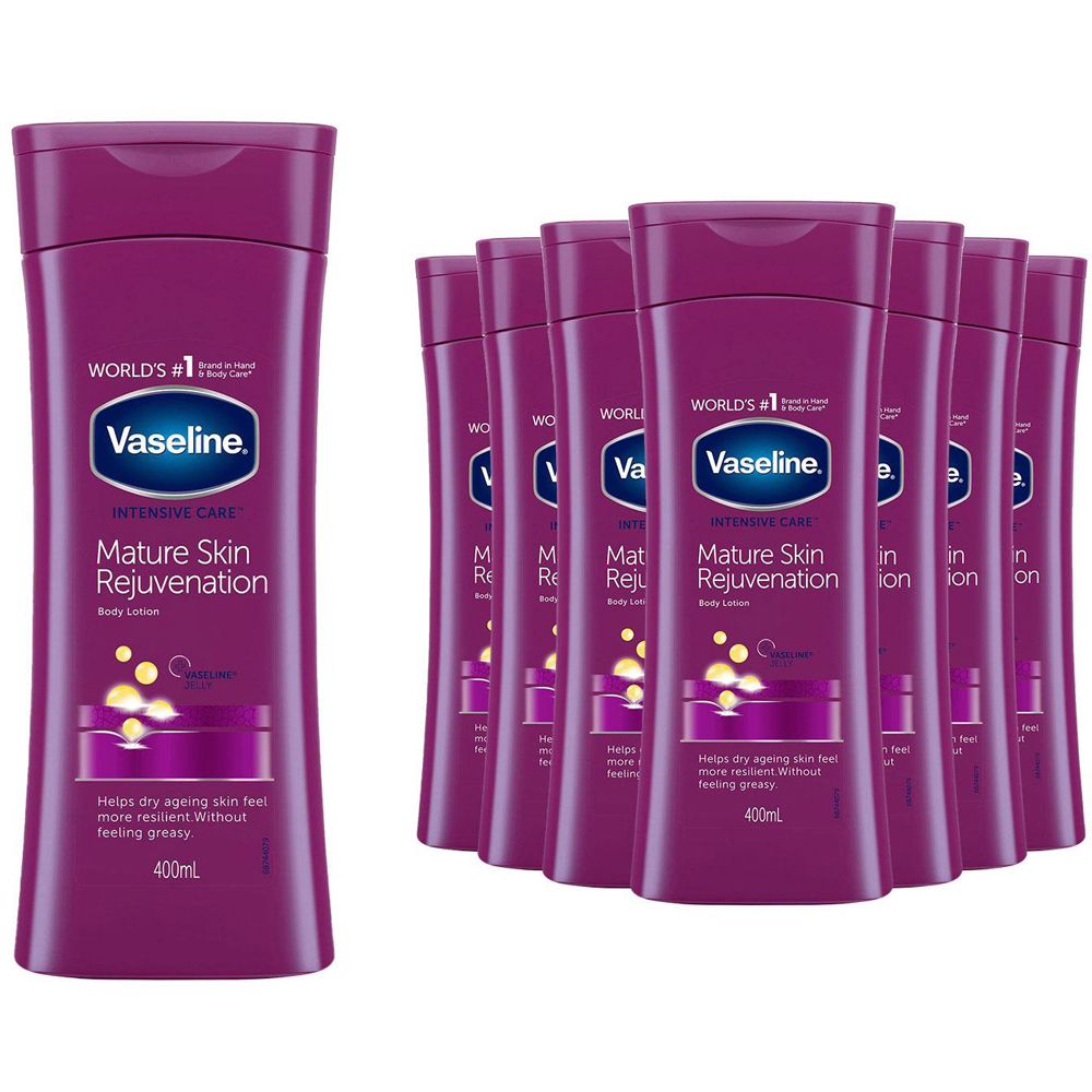 Vaseline Intensive Care Body Lotion Mature Skin Rejuvenation 400ml, 8 Pack is not an ordinary moisturiser for dry skin. It heals the intense dryness often associated with mature and ageing menopausal skin, giving you softer, healthier-looking skin. From the very first application, Vaseline Mature Skin Rejuvenation Body Lotion starts to transform your skin from dry and depleted to healed and balanced. Make this firming lotion a part of your skincare routine, and your skin will feel deeply moisturised all day long. Its advanced formula, containing intensive moisturisers, PPAR Activators and Vitamin B3, strengthens the skin's protective barrier and helps replenish lost lipids. Vaseline Intensive Care Mature Skin Rejuvenation Body Lotion heals and balances menopausal skin dryness. This daily moisturiser contains micro-droplets of Vaseline Jelly which lock in moisture, relieving the tight, itchy feel of dry skin. This moisturiser for dry skin contains PPAR Activators, which are known to replenish lipids and boost ageing skin's natural renewal cycle. This Mature Skin Rejuvenation body lotion is lightly fragranced and absorbs fast for a non-greasy feel. How to Use: Apply a few drops and rub them into the skin from head to toe. Best used when applied while the skin is still damp from a shower or bath. Box Contains: 8x Vaseline Intensive Care Body Lotion Mature Skin Rejuvenation, 400ml.
