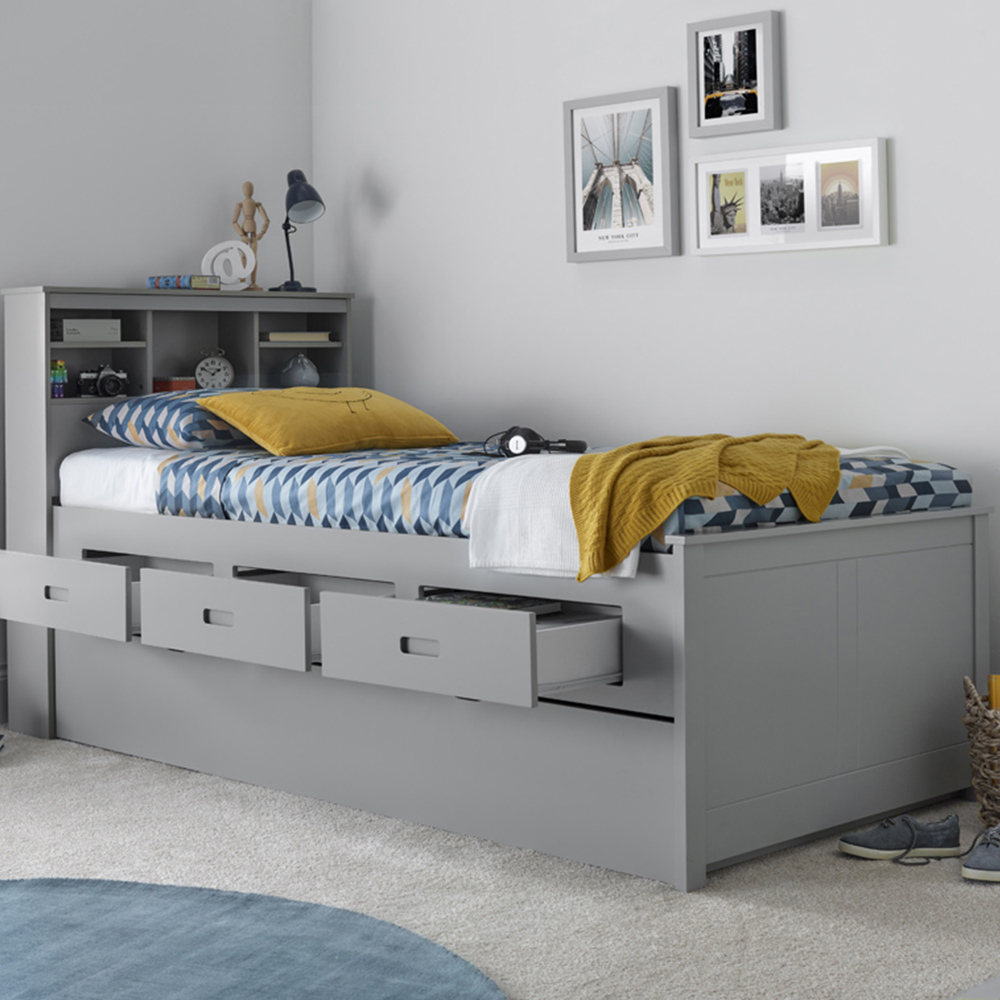 Elevate your sleeping experience with the Bedmaster Veera Grey 3 Drawer Guest Bed. Featuring a modern and compact design, this bed offers an aesthetic design and ample storage. The headboard (which can be assembled on either side) includes three shelves which are perfect for holding books and any other trinkets you may have. In addition to this, the bed features three pull-out drawers and an optional under-bed trundle measuring H31.5 x L194 x D94cm (sold separately). With the trundle, this bed transforms from a single bed frame to a bed which supports two sleepers. This is the version with no trundle. The bed comes with a single Clay orthopaedic mattress. Also, it is supplied flat-packed to a room of choice. Each shelf space has D17.5cm, H28cm and W30cm, except the middle shelf, which is W30cm. The two side shelves are divided into 9cm and 19cm high spaces. Please note: The bed requires self-assembly and the headboard height is 65.5cm. The turn and rotate mattress is tested to BS7177.