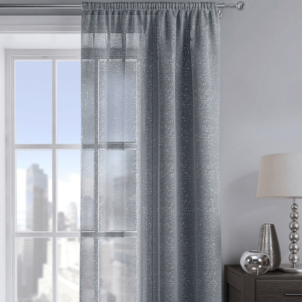 Add a touch of sparkle to your home with this Velosso Alessandria Charcoal Shimmer Voile Panel Curtain 137 x 183cm. It's made from 100% polyester and flaunts a charcoal hue to offer you a beautiful addition to any room. This sheer curtain is woven with subtle silver thread, giving it a shimmering effect when the light falls on it. It's easy to hang with its slot top and is machine washable for added ease. With this charming voile curtain, enhance your living space decor effortlessly.