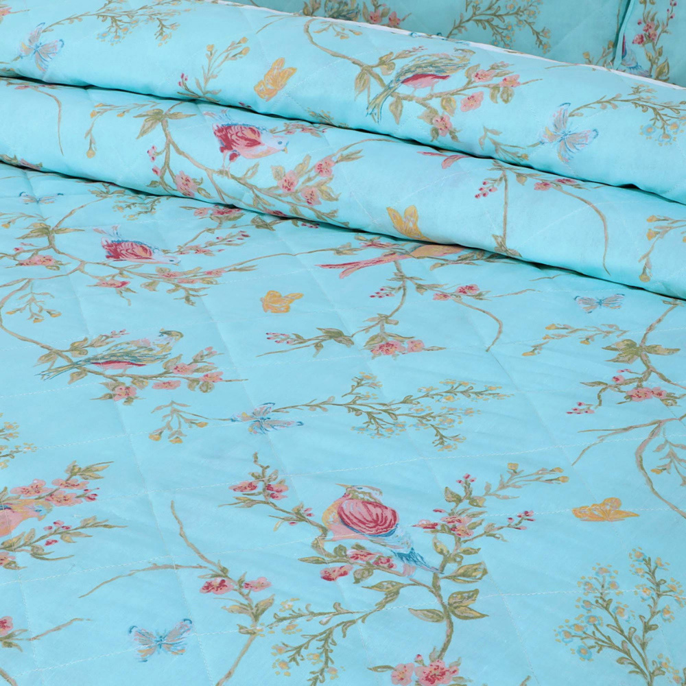 Add a touch of natural beauty to your bedroom with the Velosso Double Birds Floral Duck Egg Bedspread Set. Whether your style is contemporary or traditional, this exceptional bedspread set can transform your space into a tranquil sanctuary. With this set, you can indulge in both comfort and style. This remarkable addition to your bedding collection can elevate your bedroom to a realm of luxury. The sumptuously thick quilted bedspread adorned with a charming pattern of birds perched on delicate branches on a duck egg background creates a haven of timeless elegance. The coordinating pillowcases complete the design, capturing the beauty of nature. Crafted from a lavish blend of polycotton, the bedspread offers a gentle caress against your skin, imparting an unmatched sense of comfort. This duck egg floral bedspread set boasts remarkable fade-resistant quality, maintaining its allure over time. The fabric's strength ensures longevity even through extensive use, and wrinkles retreat with ease as you iron. The set is machine washable, making it extremely easy to maintain. Embrace both comfort and style with this bedspread set – a truly exquisite addition to your bedding collection. The set includes two pillowcases.