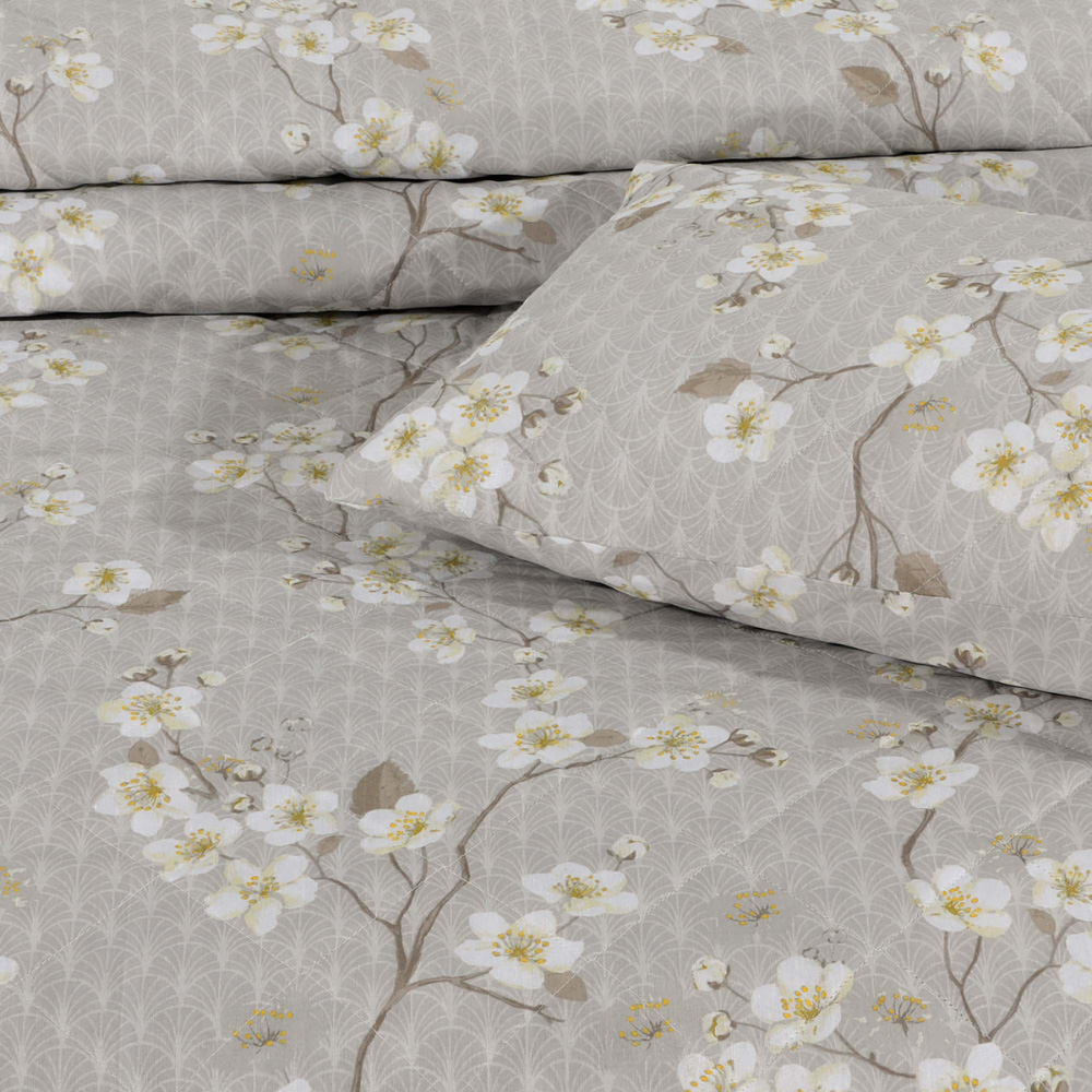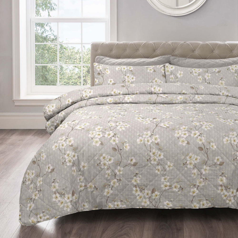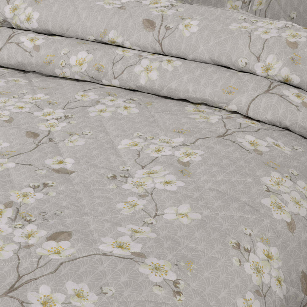 Give your bedroom a fresh and pretty feel with the Velosso Double Cherry Blossom Bedspread Set. The set features a lightweight design that provides exceptional comfort without compromising on warmth. It's the perfect choice for all seasons, keeping you cosy during cold nights while offering a breathable feel in warmer weather. Made from a luxurious blend of polycotton, this bedspread set is resistant to fading and easy to iron, ensuring ultimate durability without sacrificing style. The reverse side, crafted from 100% polyester, adds an extra layer of softness for a comfortable sleep surface. More than just a bedding accessory, this set serves as a stunning decorative piece that brings the beauty of nature into your bedroom. The delicate cherry blossom pattern adds a touch of tranquillity and elegance, instantly transforming your space into a peaceful sanctuary. The set is machine washable, making it extremely easy to maintain. Embrace both comfort and style with this bedspread set – a truly exquisite addition to your bedding collection. The set includes two pillowcases.